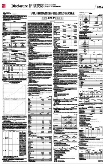 基金管理人:华安基金管理有限公司 基金托管人:中国银行股份有限公司 报告送出日期:二〇一四年八月二十九日 §1 重要提示及目录 1.1 重要提示 基金管理人的董事会、董事保证本报告所载资料不存在虚假记载、误导性陈述或重大遗漏,并对其内容的真实性、准确性和完整性承担个别及连带的法律责任。本半年度报告已经三分之二以上独立董事签字同意,并由董事长签发。 基金托管人中国银行股份有限公司根据本基金合同规定,于2014年8月26日复核了本报告中的财务指标、净值表现、利润分配情况、财务会计报告、投资组合报告等内容,保证复核内容不存在虚假记载、误导性陈述或者重大遗漏。 基金管理人承诺以诚实信用、勤勉尽责的原则管理和运用基金资产,但不保证基金一定盈利。 基金的过往业绩并不代表其未来表现。投资有风险,投资者在作出投资决策前应仔细阅读本基金的招募说明书及其更新。 本半年度报告摘要摘自半年度报告正文,投资者欲了解详细内容,应阅读半年度报告正文。 本报告中财务资料未经审计。 本报告期自2014年1月1日起至6月30日止。 2 基金简介 2.1 基金基本情况 ■ 注:根据中国证监会2013 年12 月3 日下发的《关于华安双月鑫短期理财债券型证券投资基金基金份额持有人大会决议备案的回函》(基金部函[2013]1026 号),华安双月鑫短期理财债券型证券投资基金自2013 年12 月27 日起变更为华安月安鑫短期理财债券型证券投资基金,修改基金合同中基金的名称、运作期、基金的基本情况、基金的备案、基金份额的集中申购、赎回与转换、基金份额持有人大会等条款。修订后的《华安月安鑫短期理财债券型证券投资基金基金合同》自2013 年12 月27 日起正式生效。 2.2 基金产品说明 ■ 2.3 基金管理人和基金托管人 ■ 2.4 信息披露方式 ■ 3 主要财务指标和基金净值表现 3.1 主要会计数据和财务指标 金额单位:人民币元 ■ 注:本期已实现收益指基金本期利息收入、投资收益、其他收入(不含公允价值变动收益)扣除相关费用后的余额,本期利润为本期已实现收益加上本期公允价值变动收益,由于货币市场基金采用摊余成本法核算,因此,公允价值变动收益为零,本期已实现收益和本期利润的金额相等。 3.2 基金净值表现 3.2.1基金份额净值收益率及其与同期业绩比较基准收益率的比较 1. 华安月安鑫短期理财债券A: ■ 2. 华安月安鑫短期理财债券B: ■ 注:根据中国证监会2013 年12 月3 日下发的《关于华安双月鑫短期理财债券型证券投资基金基金份额持有人大会决议备案的回函》(基金部函[2013]1026 号),华安双月鑫短期理财债券型证券投资基金自2013 年12 月27 日起变更为华安月安鑫短期理财债券型证券投资基金,修改基金合同中基金的名称、运作期、基金的基本情况、基金的备案、基金份额的集中申购、赎回与转换、基金份额持有人大会等条款。修订后的《华安月安鑫短期理财债券型证券投资基金基金合同》自2013 年12 月27 日起正式生效。 3.2.2自基金合同生效以来基金累计净值收益率变动及其与同期业绩比较基准收益率变动的比较 华安月安鑫短期理财债券型证券投资基金 累计净值增长率与业绩比较基准收益率历史走势对比图 (2012年6月14日至2014年6月30日) 1、华安月安鑫短期理财债券A ■ 2、华安月安鑫短期理财债券B ■ 注:(1)根据中国证监会2013 年12 月3 日下发的《关于华安双月鑫短期理财债券型证券投资基金基金份额持有人大会决议备案的回函》(基金部函[2013]1026 号),华安双月鑫短期理财债券型证券投资基金自2013 年12 月27 日起变更为华安月安鑫短期理财债券型证券投资基金,修改基金合同中基金的名称、运作期、基金的基本情况、基金的备案、基金份额的集中申购、赎回与转换、基金份额持有人大会等条款。修订后的《华安月安鑫短期理财债券型证券投资基金基金合同》自2013 年12 月27 日起正式生效。 (2)根据《华安双月鑫短期理财债券型证券投资基金基金合同》和《华安月安鑫短期理财债券型证券投资基金基金合同》规定,本基金已自基金合同生效之日起每个运作期的10 个工作日内使基金的投资组合比例符合基金合同的约定。 4 管理人报告 4.1 基金管理人及基金经理情况 4.1.1 基金管理人及其管理基金的经验 华安基金管理有限公司经中国证监会证监基金字[1998] 20号文批准于1998年6月设立,是国内首批基金管理公司之一,注册资本1.5亿元人民币,公司总部设在上海陆家嘴金融贸易区。目前的股东为上海电气(集团)总公司、上海国际信托有限公司、上海工业投资(集团)有限公司、上海锦江国际投资管理有限公司和国泰君安投资管理股份有限公司。 截至2014年6月30日,公司旗下共管理了华安创新混合、华安中国A股增强指数、华安现金富利货币、华安宝利配置混合、华安宏利股票、华安中小盘成长股票、华安策略优选股票、华安核心优选股票、华安稳定收益债券、华安动态灵活混合、华安强化收益债券、华安行业轮动股票、华安上证180ETF、华安上证180ETF联接、华安上证龙头企业ETF、龙头ETF联接、华安升级主题股票、华安稳固收益债券、华安可转换债基金、华安深证300指数基金(LOF)、华安科技动力股票、华安四季红债券、华安香港精选股票、华安大中华升级股票、华安标普石油指数基金(QDII-LOF)、华安月月鑫短期理