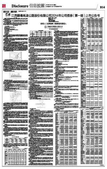 江西赣粤高速公路股份有限公司2014年公司债券(第一期)上市公告书 第一节 绪言 重要提示:江西赣粤高速公路股份有限公司(以下简称“赣粤高速”、“发行人”或“公司”)董事会成员已批准该上市公告书,确信其中不存在任何虚假、误导性陈述或重大遗漏,并对其真实性、准确性、完整性负个别的和连带的责任。 上海证券交易所(以下简称“上交所”)对江西赣粤高速公路股份有限公司公开发行2014年公司债券(第一期)(以下简称“本期债券”)上市申请及相关事项的审查,均不构成对本期债券的价值、收益及兑付作出实质性判断或任何保证。 发行人本期债券债项评级为AAA;本期债券上市前,发行人最近一期末的净资产为135.71亿元(截至2014年3月31日合并报表所有者权益),资产负债率为53.39%;债券上市前,发行人2011-2013年度实现的归属于母公司净利润为11.09亿元、11.70亿元、6.54亿元,最近三个年度年均可分配利润为9.77亿元,预计不少于债券一年利息的1.5倍。发行人在本次发行前的财务指标符合相关规定。 第二节 发行人简介 一、 发行人法定名称 中文名称:江西赣粤高速公路股份有限公司 英文名称:Jiangxi Ganyue Expressway CO., LTD 发行人住所及办公地址 住所:南昌市高新区火炬大街199号赣能大厦 办公地址:江西省南昌市西湖区朝阳洲中路367号赣粤大厦 二、 发行人注册资本 注册资本:人民币2,335,407,014元 三、 发行人法人代表 法定代表人:黄铮 四、 发行人基本情况 (一)经营范围 公司经营范围为:项目融资、建设、经营、管理、公路、桥梁和其他交通基础设施的投资、建设、管理、收费、养护管理及公路、桥梁和其他交通基础设施的附属设施的开发、经营;高等级公路通讯、监控、收费系统及其设备、交通配套设施的生产、加工、销售及施工;交通工程咨询;苗圃和园林绿化;筑路材料加工和经营(以上项目国家有专项规定的除外)。 (二)主要业务 公司是江西省唯一一家高速公路上市公司。公司主要从事高速公路的管理、养护、收费和投资,高速公路的车辆通行服务收入是公司收入和利润的主要来源,主要经营模式是:通过投资建设或收购等多种方式获得经营性公路资产,为过往车辆提供通行服务,按照收费标准收取车辆通行服务收入,并对运营公路进行管理、养护及维修,以保证公路的通行质量。 1、我国高速公路行业的发展 高速公路所属的交通运输行业是国民经济发展的基础产业和先导产业。随着我国经济的高速发展,以及国家产业政策的大力扶持,近年来我国高速公路路网建设实现了跨越式发展。“十五”期间,我国高速公路通车里程以年均0.50万公里的速度递增,通车里程跃居世界第二,比“九五”期间新增2.4万公里。“十一五”时期,高速公路里程达到7.41万公里,居世界第二位。国家高速公路网主骨架预计“十二五”末将基本建成,届时,中国高速公路通车总里程将有望达10万公里,超过美国跃居世界第一。 为了进一步加强全国高速公路的规划和发展,国务院2004年底审议通过了《国家高速公路网规划》,根据这一规划,我国将在未来30年内投资2万亿元新建高速公路,在原有“五纵七横”国道主干线的基础上,形成由中心城市向外放射以及横连东西、纵贯南北的大通道,由7条首都放射线、9条南北纵向线和18条东西横向线组成,简称为“7918网”,总规模约8.50万公里。国家高速公路网总体上实现“东网、中联、西通”的目标:东部地区基本形成高速公路网,长江三角洲、珠江三角洲、环渤海地区形成较完善的城际高速公路网络;中部地区对外连接通道全面建成,地区内部中心城市间实现高速沟通;西部地区建成西部开发8条省际公路通道中的高速公路,实现东西互动。根据“十二五”规划及相关目标,我国高速公路行业在“十二五”期间将继续保持较高的增长速度,特别是中西部地区高速公路通车里程将有较大的增长。 国家高速公路网布局方案,如下图所示: ■ 2、江西省高速公路发展现状和规划 江西省地处中国东南偏中部长江中下游南岸,东邻浙江、福建,南连广东,西靠湖南,北接湖北、安徽。江西省作为长江三角洲、珠江三角洲和闽南三角地区的腹地,与上海、广州、厦门、南京、武汉、长沙、合肥等各重镇、港口的直线距离,大多在六百至七百公里之内,交通便利,地理位置优越。2013年江西新增高速公路通车里程75公里,全省高速公路通车里程4,335公里。目前江西省“三纵四横”高速公路主骨架已基本建成,鄱阳湖生态经济区环线公路全部高速化,省会南昌到各设区市主干线公路全部高速化,出省主通道全部高速化,形成了省内4小时经济圈和省际8小时经济圈。 江西省近年来经济发展明显加速,自2002年以来,江西省GDP每年增幅均超过全国平均增幅。2013年江西省GDP 为14,338.50亿元,同比增长10.1%,实现自2003年以来的连续十一年10%以上的增长。2013年江西省财政总收入2,357.1亿元,同比增长15.2%。2013年,江西省交通运输业投资不断提高,高速公路里程增加,道路运输环境更为优化,客货运输业务稳定增长。2013年1-7月份,江西省道路运输完成客运量4.57亿人、旅客周转量229.2亿人公里、货运量6.74亿吨、货物周转量1485.1亿吨公里,同比分别增长3.29%、2.91%、8.62%和14.33%;水路运输完成客运量143.6万人、旅客周转量1750万人公里,同比分别下降3.49%和9.28%,完成货运量4725.9万吨、货物周转量119.3