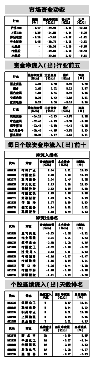 资金策市 Money Flow 2013年以来连续加仓后,今年二季度末机构对创业板股出现了减持迹象。二季度末机构合计持有创业板股54.39亿股,较一季度环比略降0.81%,在机构开始减仓的同时,36只个股更是连续两个季度无机构现身前十大流通股东名单。统计显示,无机构捧场的创业板股主要集中在电气设备、机械设备、计算机等三大行业,而就业绩来说,36只个股上半年合计净利润5.09亿元,同比下降 21.77%,业绩下滑明显。 二季末机构持有创业板股比例排名 各类资金当日净流量对比 2、机构连续两季未入围36只创业板股前十大 1、二季度末全部机构总体略微减持创业板股 3、连续两季无机构捧场36只创业板股今年股价依然强势 连续两季无机构持有创业板股 (专题数据由证券时报中心数据库提供,数据来源于上市公司公告,若有出入,请以公告为准) 据STCN资金流向快报(http://data.stcn.com/statisticalData.shtml)数据显示,9月9日,沪深两市共流出资金93.24亿元,连续第4个交易日净流出。其中,沪市净流出45.80亿元,深市净流出47.44亿元。主力资金合计流出34.69亿元。 指数方面,上证180指数成份股合计资金流出24.80亿元,深证成指成份股资金流出5.63亿元,沪深300指数成份股资金流出35.58亿元。以股本规模计,流通盘中大盘股资金流出30.38亿元,中盘股资金流出29.82亿元,小盘股资金流出33.04亿元。 行业方面,按照衍生申万一级行业分类计,有6个行业资金净流入,19个行业资金净流出。其中,商业贸易流入资金4.28亿,成为资金最关注的行业;交运设备流出资金14.19 亿,有较明显的资金出逃现象。 家用电器业已持续7个交易日净流入资金,共流入资金6.27亿,居行业连续流入天数榜首位。电子元器件业已持续5个交易日净流出资金,共流出资金57.46亿,为行业连续流出天数榜第一。 江南化工已持续9个交易日净流入资金,累计流入资金0.67亿,居个股连续流入天数榜首位。新北洋已持续20个交易日净流出资金,累计流出资金3.93亿,为个股连续流出天数榜第一。 股指期货方面,IF1409合约收报2457.60点,微跌0.36%;成交60.50万手,持仓量减4904手,收报14.35万手。(黄舒欣) 本版导读: