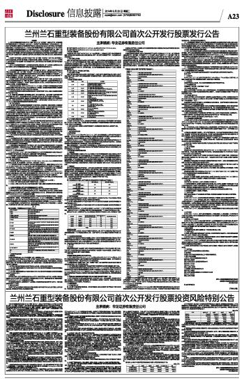 发行人:兰州兰石重型装备股份有限公司 主承销商:华龙证券有限责任公司 2014年9月23日 附:初步询价情况表 (下转A24版) 本版导读: