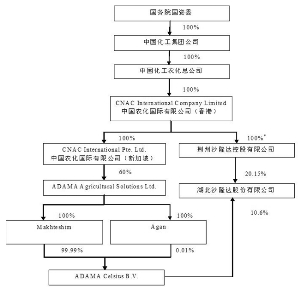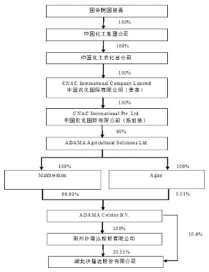 本公司及董事会全体成员保证信息披露的内容真实、准确、完整,没有虚假记载、误导性陈述或重大遗漏。 本公司曾于2014年9月24日披露了《关于控股股东股权变更的提示性公告》,中国化工农化总公司("中农化")已将其所持有的荆州沙隆达控股有限公司("荆州沙隆达",本公司控股股东)100%股权注入到中国农化国际有限公司("农化国际");2014年10月9日披露了《关于控股股东股权转让的提示性公告》,农化国际拟将其持有的沙隆达控股100%股权转让给ADAMA Celsius B.V.("Celsius"),从而将导致Celsius直接和间接合计持有本公司总股本的30.75%。2014年10月10日,本公司接到中农化通知,中国证监会已于当日受理了ADAMA Celsius B.V.("Celsius")提交的《要约收购义务豁免核准》申请材料。 本公司与实际控制人股权结构及控制关系图之转让完成前: ■ 本公司与实际控制人股权结构及控制关系图之转让完成后: ■ 上述股权转让完成后,本公司的最终实际控制人未发生变更,仍为国务院国资委,直接控股股东也未发生变更,仍为沙隆达控股。 本公司将根据该事项的进展严格按照有关规定及时履行相关信息披露义务,敬请广大投资者关注且注意投资风险。 特此公告。 湖北沙隆达股份有限公司董事会 2014年10月10日 本版导读: