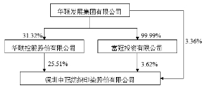 (上接B61版) 本次股权转让后的股权结构变更为: ■ (2)1990年11月,第三次股权转让 1990年11月,经深圳市人民政府深府外复【1990】第878号文批准,香港兴茂有限公司将其持有的3.5%股权转让给忻礼轼;邹星炳将其持有的2%股权转让给王国泰。 本次股权转让后的股权结构变更为: ■ (3)1991年12月,第四次股权转让 1991年12月,经深圳市人民政府深府外复【1991】第1365号文批准,香港布拉克莱恩投资有限公司(BALLAGLINE INVESTMENTS LTD.)将其持有的5%股权转让给香港富冠投资有限公司(RICH CROWN INVESTMENT LTD.)、5%股权转让给香港侨民有限公司(OVERSEAS ASSOCIATES LTD.)。 本次股权转让后的股权结构变更为: ■ (4)公司改制 根据深圳市人民政府深府办复【1991】第940号文批准,深圳中冠印染有限公司的净资产95,981,725.70元中的91,879,161元折为股本,由深圳中冠印染有限公司股东按原持股比例分别持有。 本次公司改制后的股权结构变更为: ■ (5)A股、B股发行上市 1991年12月25日,中国人民银行深圳经济特区分行以深人银复【1991】第123号文同意本公司新增发行人民币普通股1520万股,包括向社会公众发行1200万股,向本公司内部发行320万股。1992年4月7日,中国人民银行深圳经济特区分行以深人银复【1992】第044号文同意本公司向境外发行人民币特种股票B股52,157,707股,其中原外方发起人股东持有股份32,157,707股转为B股,新增发行2000万股B股。 本次发行后的股权结构变更为: ■ (二)上市后的历次股本变动情况 1993年4月22日,上市公司第一届第二次股东大会审议通过关于1992年盈利分配方案的决议,实施分红送股方案,按每10股送1股的比例向全体股东送股,送股总数为12,707,921股。送股后上市公司总股本为139,787,073股。 1994年6月3日,上市公司第一届第三次股东大会审议通过关于1993年盈利分配方案的决议,实施分红送股方案,按每10股送1股的比例向全体股东送股,送股总数为13,978,704股。送股后上市公司总股本为153,765,777股。 1995年6月8日,上市公司董事会决议并经深圳市证券管理办公室深证办复[1995]95号批复,实施分红送股方案,按每10股送1股的比例向全体股东送股,送股总数为15,376,579股。送股后上市公司总股本为169,142,356股。 截至本预案签署之日,上市公司总股本为169,142,356股。 (三)控股股东变动情况 中冠股份系由华联纺织(集团)有限公司、深圳市纺织工业公司联合五位香港投资者于1984年4月盘购外商独资企业新南新染厂有限公司的产权而成立,华联纺织(集团)有限公司持有35%的股权,为公司控股股东。1999年12月,华联控股即原深圳惠中化纤股份有限公司受让了华联集团出让其所持有的本公司法人股47,359,859股,华联控股持有本公司28%的股份,成为本公司第一大股东及控股股东。截至本预案签署之日,华联控股仍是本公司第一大股东及控股股东。 三、控股股东及实际控制人概况 中冠股份的控股股东为华联控股,实际控制人为华联集团,近三年控制权未发生变化。截至本预案签署之日,华联控股直接持有本公司43,141,032股股份,持股比例为25.51%。华联集团直接持有本公司5,681,089股股份,华联集团直接及间接持有本公司的股权比例为32.48%。 (一)产权控制关系图 截至本预案签署之日,中冠股份的产权控制关系如下图所示: ■
