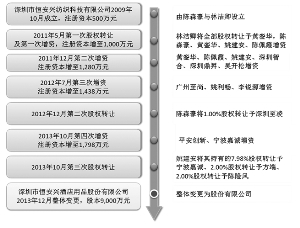 (上接B14版) (五)深圳至凌 1、基本情况 ■ 2、出资结构及控制关系图 截至本报告书签署日,深圳至凌各合伙人出资额及出资比例如下: ■ 截至本报告书签署日,深圳至凌的出资结构关系图如下: ■ 3、历史沿革 (1)2012年12月,深圳至凌设立 2012年12月3日,王锋、王少莹、杨明、黄爱凌、聂子臻、魏玉兰、胡少妹、张小梅、杨易、梁萍、周晔、李海梦、罗晓微、肖红、刘金宇、汪金红、林桃、刘婷利、林强、石涛、钟卯芳、胡丁丹、张新松签署《深圳市至凌投资管理中心(有限合伙)合伙协议》,约定共同出资设立深圳至凌,出资额为人民币91万元。2012年12月13日,深圳至凌取得《合伙企业营业执照》(注册号:440303602334038)。深圳至凌设立时的各合伙人出资额及出资比例如下: ■ (2)2013年9月,第一次出资转让 2013年9月6日,深圳至凌通过合伙人会议决议:同意有限合伙人张小梅将其持有的深圳至凌1.43%的出资以人民币1.33万元的价格转让给普通合伙人王锋,同意有限合伙人杨易将其持有的深圳至凌12.86%的出资以人民币11.94万元的价格转让给普通合伙人王锋,同意有限合伙人李海梦将其持有的深圳至凌1.43%的出资以人民币1.34万元的价格转让给普通合伙人王锋,同意有限合伙人汪金红将其持有的深圳至凌7.14%的出资以人民币6.72万元的价格转让给普通合伙人王锋。2013年9月6日,各方签署了《出资转让协议书》。2013年9月16日,深圳市市场监督管理局核准上述变更事宜。本次出资转让完成后,深圳至凌各合伙人出资额及出资比例如下: ■ (3)2013年10月,第二次出资转让 2013年10月21日,深圳至凌通过合伙人会议决议:同意普通合伙人王锋将其持有的深圳至凌14.29%出资以人民币13.00万元的价格转让给有限合伙人王少莹。2013年10月22日,各方签署了《出资转让协议书》。2013年10月31日,深圳市市场监督管理局核准上述变更事宜。本次出资转让完成后,深圳至凌各合伙人出资额及出资比例如下: ■ (4)2014年7月,第三次出资转让 2014年7月17日,深圳至凌通过合伙人会议决议:同意普通合伙人王锋将其持有的深圳至凌7.14%的出资以人民币13.50万元的价格转让给有限合伙人彭正勇,同意普通合伙人王锋将其持有的深圳至凌1.43%的出资以人民币2.70万元的价格转让给有限合伙人刘燕华。2014年7月18日,各方签署了《出资转让协议书》。2014年7月23日,深圳市市场监督管理局核准上述变更事宜。本次出资转让完成后,深圳至凌各合伙人出资额及出资比例如下: ■ 4、最近三年主要业务发展状况 深圳至凌是恒安兴的员工持股平台,没有其他业务。 5、主要财务数据 最近三年的主要财务数据如下: 单位:万元 ■ 注:以上数据未经审计。 (六)陈佩霞 1、基本情况 ■ 2、最近三年的职业和职务及任职单位产权关系 ■ 3、对外投资情况 截至本报告书签署日,除持有恒安兴1.78%的股权外,无其他对外投资。 (七)平安创新 1、基本情况 ■ 2、股东结构及产权控制关系图 截至本报告书签署日,平安创新股东结构如下: ■ 截至本报告书签署日,平安创新的产权控制关系图如下: ■ 3、历史沿革 (1)1992年11月设立 1992年10月12日,深圳市人民政府办公厅出具《关于成立深圳平安实业投资公司的批复》(深府办复[1992]1226号),同意平安保险成立深圳平安实业投资公司。1992年10月2日,平安保险出具资金来源证明,证明深圳平安实业投资公司注册资本金人民币2,000万元由其以现金形式直接投入。1992年11月24日,深圳平安实业投资公司取得《企业法人营业执照》(注册号:19221023-9号)。 (2)1998年3月,第一次股权转让 1997年10月20日,平安保险通过董事会决议,将深圳平安实业投资公司80%出资以人民币11,888,917.63元转让给平安信托投资公司。1997年10月23日,平安保险作出《关于改组深圳平安实业投资公司的决定》,将公司名称变更为深圳平安实业投资有限公司,并将其持有80%出资以人民币11,888,917.63元转让给平安信托投资公司,1997年10月23日双方签署股权转让合同书。1997年10月27日,深圳平安实业投资公司通过股东会决议同意公司名称变更为深圳市平安实业投资有限公司,同意住所从深圳市红岭中路7号国际信托大厦二楼变更到深圳市八卦岭八卦三路平安大厦三楼,同意原股东平安保险将80%的出资转让给平安信托投资公司。1998年3月23日,深圳市工商行政管理局核准了上述变更。 深圳市平安实业投资有限公司变更后的股权结构如下: ■ (3)2005年3月,第二次股权转让 2004年8月13日,深圳市平安实业投资有限公司股东会同意平安保险将其所持有的深圳市平安实业投资有限公司20%股权转让给深圳市平安物业投资管理有限公司。2004年9月20日,双方签署了股权转让协议。2005年3月8日,深圳市工商行政管理局核准了上述变更。 深圳市平安实业投资有限公司变更后的股权结构如下: ■ (4)2008年5月,第三次股权转让、第一次增资 2008年4月18日,深圳市平安实业投资有限公司召开股东会,同意深圳平安物业设施管理有限公司将其持有的20%股份转让给股东平安信托投资有限责任公司,同意平安信托投资有限责任公司进行增资,增资后深圳市平安实业投资有限公司注册资本变更为100,000万元。2008年4月19日,深圳平安物业设施管理有限公司与平安信托投资有限责任公司签署股权转让协议。2008年4月29日,深圳衡大会计师事务所出具《验资报告》(深衡大验字[2008]57号),验证截至2008年4月29日,深圳