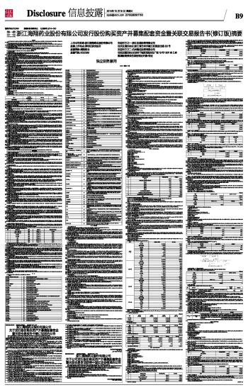 证券代码:002099 证券简称:海翔药业 公告编号:2014-079 浙江海翔药业股份有限公司 关于发行股份购买资产并募集配套资金 暨关联交易报告书修订说明的公告 本公司及董事会全体成员保证信息披露内容的真实、准确和完整,没有虚假记载、误导性陈述或重大遗漏。 浙江海翔药业股份有限公司(以下简称"本公司")于2014年5月6日披露了《浙江海翔药业股份有限公司发行股份购买资产并募集配套资金暨关联交易报告书(草案)》等相关文件(全文披露于巨潮资讯网www.cninfo.com.cn)。根据中国证监会对本次重大资产重组反馈意见的要求以及《关于核准浙江海翔药业股份有限公司向浙江东港投资有限公司等发行股份购买资产并募集配套资金的批复》(证监许可[2014]1043号),本公司对重组报告书进行了部分补充、修改和完善。重组报告书补充和修改的主要内容如下: 1、报告期期末由2013年12月31日调整为2014年6月30日,在"第一节 交易概述"、"第二节 上市公司基本情况"、"第三节 交易对方基本情况"、"第四节 标的资产情况"、"第五节 本次交易发行股份情况"、"第九节 本次交易对上市公司影响的讨论与分析"、"第十节 财务会计信息"和"第十三节 其他重大事项"中更新披露了本公司2014年1-6月的经营情况、财务报表和备考合并财务报表,标的公司2014年1-6月的经营状况、主要资产、负债及财务报表等信息,以及交易对方2014年1-6月的主要财务数据。 2、本次重大资产重组已取得中国证监会的核准文件,在"第一节 交易概述"之"四、本次交易的决策过程和批准情况"之"(一)本次交易已获得的授权和批准"中更新了本次重组已履行的相关决策和审批程序,并删除了"第一节 交易概述"之"四、本次交易的决策过程和批准情况"之"(二)本次交易尚需获得的授权、批准和核准"和"重大事项提示"之"十四、本次交易尚需履行的审批程序"和"十五、股票停复牌安排"。 3、2014年6月17日,上市公司收到中国证券结算有限公司深圳分公司出具的《证券过户登记确认书》,罗煜竑先生协议转让给王云富先生的5,940万股公司股份(占总股本的18.31%)完成了过户登记手续。在"重大事项提示"、"第一节 交易概述"、"第二节 上市公司基本情况"、"第七节 本次交易的合规性分析"、"第十一节 同业竞争与关联交易"中更新了股份转让完成过户登记手续的情况。 4、在"第五节 本次交易发行股份情况"之"三、募集配套资金的用途和必要性"补充披露了配套募集资金有利于提高本次重组项目的整合绩效、募集配套资金用于标的资产持续发展的具体内容、配套募集资金失败的补救措施等相关内容。 5、在"第十二节 本次交易对上市公司治理结构的影响"之"三、上市公司的募集资金使用制度情况"中补充披露了有关募集资金存储、使用、变更、监督和责任追究等相关内容。 6、在"第九节 本次交易对上市公司影响的讨论与分析"之"四、本次交易后上市公司持续发展能力分析及未来发展规划"中补充披露了关于重组后上市公司的主营业务构成、定位及发展方向等相关内容。 7、在"第九节 本次交易对上市公司影响的讨论与分析"之"五、本次交易后上市公司现有业务与标的资产相关业务之间的整合计划"中补充披露了关于重组后上市公司现有业务与标的资产相关业务的整合计划及相关风险的内容。 8、在"第四节 标的资产情况"之"二、台州前进历史沿革"中补充披露了关于台州前进历次股权变动原因等相关内容。 9、在"第四节 标的资产情况"之"三、台州前进股权控制关系"之"(二)台州前进下属子公司"中补充披露了关于台州前进的子公司历次股权变动原因、东港贸易历史上股份代持的原因等相关内容。 10、在"第三节 交易对方基本情况"之"一、交易对方基本情况"中补充披露了关于东港投资、勤进投资的历次股权转让、增资原因及是否存在股权代持情形、东港工贸集团的设立及其股东变化情况等相关内容。 11、在"第三节 交易对方基本情况"之"一、交易对方基本情况"之"(二)杭州勤进投资有限公司"中补充披露了勤进投资与上市公司及其实际控制人之间是否存在关联关系等相关内容。 12、在"第十一节 同业竞争与关联关系"之"一、同业竞争"之"(二)本次交易完成后的同业竞争情况"中补充披露了关于本次重组后上市公司与东港工贸集团的经营和业务关系的相关内容。 13、在"第四节 标的资产情况"之"五、台州前进主营业务发展情况"之"(十三)生产经营相关的主要资产情况"之"3、专利情况"中补充披露了关于标的资产拥有/正在申请的共有专利的权利归属情况、标的资产正在申请的专利的权利的进展情况及费用承担方式等相关内容。 14、在"第四节 标的资产情况"之"五、台州前进主营业务发展情况"之"(十三)生产经营相关的主要资产情况"之"4、商标情况"中补充披露了关于标的资产商标申请及受让办理进展情况及费用承担等相关内容。 15、在"第四节 标的资产情况"之"六、台州前进最近两年一期经审计的主要财务数据"中补充披露了标的资产净利润大幅增长的原因及其合理性、标的资产与同行业净利润、净资产收益率、总资产收益率和毛利率差异的原因及其合理性的相关内容。 16、在"第九节 本次交易对上市公司影响的讨论与分析"之"三、本次交易后上市公司的财务状况、盈利能力及未来盈利趋势分析"之"(一)本次交易后