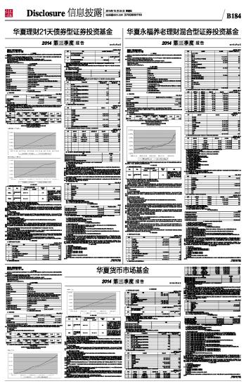 基金管理人:华夏基金管理有限公司 基金托管人:中国农业银行股份有限公司 报告送出日期:二〇一四年十月二十四日 §1 重要提示 基金管理人的董事会及董事保证本报告所载资料不存在虚假记载、误导性陈述或重大遗漏,并对其内容的真实性、准确性和完整性承担个别及连带责任。 基金托管人中国农业银行股份有限公司根据本基金合同规定,于2014年10月22日复核了本报告中的财务指标、净值表现和投资组合报告等内容,保证复核内容不存在虚假记载、误导性陈述或者重大遗漏。 基金管理人承诺以诚实信用、勤勉尽责的原则管理和运用基金资产,但不保证基金一定盈利。 基金的过往业绩并不代表其未来表现。投资有风险,投资者在作出投资决策前应仔细阅读本基金的招募说明书。 本报告中财务资料未经审计。 本报告期自2014年7月1日起至9月30日止。 §2 基金产品概况 ■ §3 主要财务指标和基金净值表现 3.1 主要财务指标 单位:人民币元 ■ 注:①所述基金业绩指标不包括持有人认购或交易基金的各项费用,计入费用后实际收益水平要低于所列数字。 ②本期已实现收益指基金本期利息收入、投资收益、其他收入(不含公允价值变动收益)扣除相关费用后的余额,本期利润为本期已实现收益加上本期公允价值变动收益。 3.2 基金净值表现 3.2.1 基金份额净值增长率及其与同期业绩比较基准收益率的比较 ■ 3.2.2 自基金合同生效以来基金份额累计净值增长率变动及其与同期业绩比较基准收益率变动的比较 华夏永福养老理财混合型证券投资基金 份额累计净值增长率与业绩比较基准收益率历史走势对比图 (2013年8月13日至2014年9月30日) ■ 注:根据华夏永福养老理财混合型证券投资基金的基金合同规定,本基金自基金合同生效之日起6个月内使基金的投资组合比例符合本基金合同第十二部分(二)投资范围、(四)投资限制的有关约定。 §4 管理人报告 4.1 基金经理(或基金经理小组)简介 ■ 注:①上述任职日期、离任日期根据本基金管理人对外披露的任免日期填写。 ②证券从业的含义遵从行业协会《证券业从业人员资格管理办法》的相关规定。 4.2 管理人对报告期内本基金运作遵规守信情况的说明 本报告期内,本基金管理人严格遵守《中华人民共和国证券投资基金法》、《公开募集证券投资基金运作管理办法》、《证券投资基金管理公司公平交易制度指导意见》、《基金管理公司开展投资、研究活动防控内幕交易指导意见》、基金合同和其他有关法律法规,本着诚实信用、勤勉尽责、安全高效的原则管理和运用基金资产,在严格控制投资风险的基础上,为基金份额持有人谋求最大利益,没有损害基金份额持有人利益的行为。 4.3 公平交易专项说明 4.3.1 公平交易制度的执行情况 本基金管理人一贯公平对待旗下管理的所有基金和组合,制定并严格遵守相应的制度和流程,通过系统和人工等方式在各环节严格控制交易公平执行。报告期内,本公司严格执行了《证券投资基金管理公司公平交易制度指导意见》和《华夏基金管理有限公司公平交易制度》的规定。 4.3.2 异常交易行为的专项说明 报告期内未发现本基金存在异常交易行为。 报告期内,未出现涉及本基金的交易所公开竞价同日反向交易成交较少的单边交易量超过该证券当日成交量5%的情况。 4.4 报告期内基金的投资策略和业绩表现说明 4.4.1 报告期内基金投资策略和运作分析 3季度,国际方面,美国经济复苏的步伐依然稳健,标普指数继续连创新高;欧洲为应对疲软的实体经济及通缩压力提前降息,维持宽松的货币政策;新兴经济体资本市场表现较好,股市和债市均有资金流入。国内方面,宏观经济继2季度定向刺激效果减弱后下行压力有所增大,房地产销售依然未见好转,货币政策再次开始定向放松。“三期叠加”时期经济始终维持脆弱的平衡,能否持续下去尚需观察房地产市场的企稳情况。在经济下行压力较大的背景下,物价仍处于平稳低位。 在宏观经济表现低于预期和资金面受新股申购影响波动稍大的背景下,债券市场经历了一定的反复,信用债表现相对突出,利率债到期收益率震荡下行。股市受“沪港通”、国企改革和货币政策定向宽松等利好因素影响,出现一波较为明显的上涨行情,大盘蓝筹股和国企改革股的上涨贯穿始终,新能源汽车、基因测序、大飞机等主题性机会不断涌现。 报告期内,本基金在债券和股市上涨的背景下单位净值表现相对较好。 4.4.2 报告期内基金的业绩表现 截至2014年9月30日,本基金份额净值为1.126元,本报告期份额净值增长率为7.96%,同期业绩比较基准增长率为1.26%。 4.5 管理人对宏观经济、证券市场及行业走势的简要展望 展望4季度,经济增速仍处于下行通道,短期内回升几率不高。在经济基本面支撑、通胀不高及流动性宽松等多方面因素推动下,债券牛市的行情尚不会完全结束。考虑到利率市场化不断深入,银行负债端成本的上行将不可逆转,3季度债券到期收益率的进一步下降对债市之后涨幅空间形成制约,但整体风险不大。 4季度,受改革深化和增量资金的入场影响,股市同经济背离的走势仍有望维持。十八届四中全会的召开有望引领改革类股票走出新一轮行情,“沪港通”落地有望拉近大盘蓝筹股与国际市场的估值差距,但市场上涨后整体机会将有所减少,需要更深入的挖