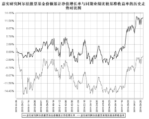 基金管理人:嘉实基金管理有限公司 基金托管人:中国农业银行股份有限公司 报告送出日期:2014年10月24日 §1 重要提示 基金管理人的董事会及董事保证本报告所载资料不存在虚假记载、误导性陈述或重大遗漏,并对其内容的真实性、准确性和完整性承担个别及连带责任。 基金托管人中国农业银行股份有限公司根据本基金合同规定,于2014年10月21日复核了本报告中的财务指标、净值表现和投资组合报告等内容,保证复核内容不存在虚假记载、误导性陈述或者重大遗漏。 基金管理人承诺以诚实信用、勤勉尽责的原则管理和运用基金资产,但不保证基金一定盈利。 基金的过往业绩并不代表其未来表现。投资有风险,投资者在作出投资决策前应仔细阅读本基金的招募说明书。 本报告期中的财务资料未经审计。 本报告期自2014年7月1日起至2014年9月30日止。 §2 基金产品概况 ■ §3 主要财务指标和基金净值表现 3.1 主要财务指标 单位:人民币元 ■ 注:(1)本期已实现收益指基金本期利息收入、投资收益、其他收入(不含公允价值变动收益)扣除相关费用后的余额,本期利润为本期已实现收益加上本期公允价值变动收益。(2)上述基金业绩指标不包括持有人认购或交易基金的各项费用,计入费用后实际收益水平要低于所列数字。 3.2 基金净值表现 3.2.1 本报告期基金份额净值增长率及其与同期业绩比较基准收益率的比较 ■ 3.2.2 自基金合同生效以来基金累计净值增长率变动及其与同期业绩比较基准收益率变动的比较 ■ 图:嘉实研究阿尔法股票基金份额累计净值增长率与同期业绩比较基准收益率的历史走势对比图(2013年5月28日至2014年9月30日) 注:按基金合同和招募说明书的约定,本基金自基金合同生效日起6个月内为建仓期,建仓期结束时本基金的各项投资比例符合基金合同“第十二部分(二)投资范围和(四)投资限制”的有关约定。 §4 管理人报告 4.1 基金经理(或基金经理小组)简介 ■ 注:(1)基金经理张琦的任职日期是指本基金基金合同生效之日,基金经理刘斌的任职日期指公司作出决定后公告之日;(2)证券从业的含义遵从行业协会《证券业从业人员资格管理办法》的相关规定。 4.2 管理人对报告期内本基金运作遵规守信情况的说明 报告期内,本基金管理人严格遵循了《证券法》、《证券投资基金法》及其各项配套法规、《嘉实研究阿尔法股票型证券投资基金基金合同》和其他相关法律法规的规定,本着诚实信用、勤勉尽责的原则管理和运用基金资产,在严格控制风险的基础上,为基金份额持有人谋求最大利益。本基金运作管理符合有关法律法规和基金合同的规定和约定,无损害基金份额持有人利益的行为。 4.3 公平交易专项说明 4.3.1 公平交易制度的执行情况 报告期内,基金管理人严格执行证监会《证券投资基金管理公司公平交易制度指导意见》和公司内部公平交易制度,各投资组合按投资管理制度和流程独立决策,并在获得投资信息、投资建议和实施投资决策方面享有公平的机会;通过完善交易范围内各类交易的公平交易执行细则、严格的流程控制、持续的技术改进,确保公平交易原则的实现;通过IT系统和人工监控等方式进行日常监控,公平对待旗下管理的所有投资组合。 4.3.2 异常交易行为的专项说明 报告期内,公司旗下所有投资组合参与交易所公开竞价交易中,同日反向交易成交较少的单边交易量超过该证券当日成交量的5%的,合计2次,均为旗下组合被动跟踪标的指数需要,与其他组合发生反向交易,不存在利益输送行为。 4.4 报告期内基金的投资策略和业绩表现说明 4.4.1 报告期内基金投资策略和运作分析 2014年三季度,经济走势从二季度以来的企稳回升趋势中显著滑落下来,但在改革预期和并购重组等因素影响下,市场和投资者情绪表现出超预期的狂热。更重要的是,A股市场自2010年以来第一次表现出持续的增量资金入市的迹象,融资买盘和新增开户大幅上升,融资净买入额不断突破历史新高,牛市预期在不断扩大的赚钱效应下形成自我强化的正反馈,过去几年的存量资金环境转变成增量资金环境,市场内部个股的驱动逻辑和模式出现了显著的变化。 本基金始终坚持以研究部的模拟组合为蓝本构建投资组合,坚持执行自下而上精选个股的投资策略,股票仓位保持在85%以上,行业偏离基准幅度控制在较小范围内,基于企业内在价值的细致基础研究的投资模式成为获取超额收益来源的重要方式。 4.4.2 报告期内基金的业绩表现 截至本报告期末本基金份额净值为1.129元;本报告期基金份额净值增长率为12.34%,业绩比较基准收益率为13.79%。 4.5 管理人对宏观经济、证券市场及行业走势的简要展望 展望四季度,目前的工业企业和国企盈利月度数据显示经济下行明显,政府表态对经济增速目标有进一步下调的可能,三季度之后的企业盈利将面临压力,市场的不确定性在增加。另一方面市场对改革预期越发强烈,相比于以房地产为代表的传统投资渠道,股票市场的相对吸引力上升,同时监管政策也为市场活跃创造条件。在这种情况下,预计未来一段时间市场可能处在震荡格局之中,市场将在经济弱改革强的博弈中运行,但由于目前相当一批主题和中小盘个股前期已有巨大的涨幅,未来可能有大的波动,后续需要对有关主题与公司进行仔细甄别与价值评估。 后续操作上,本基金将继