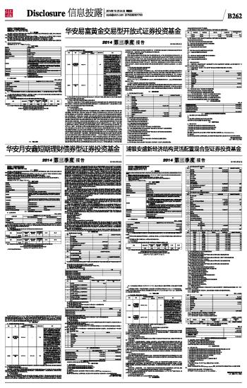 基金管理人:浦银安盛基金管理有限公司 基金托管人:交通银行股份有限公司 报告送出日期:2014年10月24日 §1 重要提示 ■ §2 基金产品概况 ■ §3 主要财务指标和基金净值表现 3.1 主要财务指标 单位:人民币元 ■ 注:1、上述基金业绩指标不包括持有人认购或交易基金的各项费用,计入费用后实际收益水平要低于所列数字。 2、本期已实现收益指基金本期利息收入、投资收益、其他收入(不含公允价值变动收益)扣除相关费用后的余额。 3、本期利润为本期已实现收益加上本期公允价值变动收益。 3.2 基金净值表现 3.2.1 本报告期基金份额净值增长率及其与同期业绩比较基准收益率的比较 ■ 3.2.2 自基金合同生效以来基金累计净值增长率变动及其与同期业绩比较基准收益率变动的比较 浦银安盛新经济结构灵活配置混合型证券投资基金 份额累计净值增长率与业绩比较基准收益率历史走势对比图 (2014年5月20日-2014年9月30日) ■ 注:1、本基金基金合同生效日为2014年5月20日,基金合同生效日至报告期期末,本基金运作时间未满一年。 2、根据基金合同第十二部分第四条规定:基金管理人应当自基金合同生效之日起6 个月内使基金的投资组合比例符合基金合同的有关约定。本基金建仓期为2014年5月20日至2014年11月19日,截至报告期末,本基金建仓期尚未结束。 §4 管理人报告 4.1 基金经理(或基金经理小组)简介 ■ 注:1、蒋建伟作为本基金的首任基金经理,其任职日期为本基金成立之日。 2、褚艳辉的任职日期为公司决定的聘任日期。 3、证券从业的含义遵从行业协会《证券业从业人员资格管理办法》的相关规定。 4.2 管理人对报告期内本基金运作遵规守信情况的说明 本报告期内,基金管理人严格遵守《证券投资基金法》及其他相关法律法规、证监会规定和基金合同的约定,本着诚实信用、勤勉尽责的原则管理和运用基金资产,在严格控制风险的前提下,为基金份额持有人谋求最大利益。本报告期内未有损害基金份额持有人利益的行为。 4.3 公平交易专项说明 4.3.1 公平交易制度的执行情况 本基金管理人根据《公平交易管理规定》,建立并健全了有效的公平交易执行体系,保证公平对待旗下的每一个基金组合。 在具体执行中,在投资决策流程上,构建统一的研究平台,为所有投资组合公平的提供研究支持。同时,在投资决策过程中,严格遵守公司的各项投资管理制度和投资授权制度,保证公募基金及专户业务的独立投资决策机制;在交易执行环节上,详细规定了面对多个投资组合的投资指令的交易执行的流程和规定,以保证投资执行交易过程的公平性;从事后监控角度上,一方面是定期对股票交易情况进行分析,对不同时间窗口(同日,3日,5日)发生的不同组合对同一股票的同向交易及反向交易进行价差分析,并进行统计显著性的检验,以确定交易价差对相关基金的业绩差异的贡献度;同时对旗下投资组合及其各投资类别的收益率差异的分析;另一方面是公司对公平交易制度的遵守和相关业务流程的执行情况进行定期检查,并对发现的问题进行及时的报告。 4.3.2 异常交易行为的专项说明 本报告期内未发现本基金存在违反法律、法规、中国证监会和证券交易所颁布的相关规范性文件中认定的异常交易行为。报告期内未发生旗下所有投资组合参与的交易所公开竞价同日反向交易成交较少的单边交易量超过该证券当日成交量的5%的情形。 4.4 报告期内基金的投资策略和运作分析 三季度,宏观经济整体运行平稳,月度间小幅波动。从结构上看,驱动经济增长的因素正逐步变化,其中,投资增速低位波动,消费平稳增长,出口逐步复苏。月度PMI指标显示制造业总体仍延续扩张态势。央行实施稳健的货币政策,流动性整体中性偏宽松,资金价格回落,年内信贷投向和结构有望进一步改善,融资利率水平小幅下行。 三季度以来,A股震荡走高。一方面,管理层对创业板再融资政策的放松,鼓励兼并收购、资产重组,驱动成长股外延扩张;另一方面,流动性出现改善叠加股市财富效应,也吸引了新的增量资金。 报告期内,本基金逐步提高权益类资产的投资比例。在投资标的选择上,以“自下而上”精选个股为主,重点关注符合未来转型方向的新兴产业。 4.5 报告期内基金的业绩表现 报告期内业绩比较基准上涨14.12%,基金净值上涨6.09%。 §5 投资组合报告 5.1 报告期末基金资产组合情况 ■ 5.2 报告期末按行业分类的股票投资组合 ■ 5.3 报告期末按公允价值占基金资产净值比例大小排序的前十名股票投资明细 ■ 5.4 报告期末按债券品种分类的债券投资组合 本基金本报告期末未持有债券。 5.5 报告期末按公允价值占基金资产净值比例大小排序的前五名债券投资明细 本基金本报告期末未持有债券。 5.6 报告期末按公允价值占基金资产净值比例大小排序的前十名资产支持证券投资明细 本基金本报告期末未持有资产支持证券。 5.7 报告期末按公允价值占基金资产净值比例大小排序的前五名贵金属投资明细 本基金本报告期末未持有贵金属。 5.8 报告期末按公允价值占基金资产净值比例大小排序的前五名权证投资明细 本基金本报告期末未持有权证。 5.9 报告期末本基金投资的股指期货交易情况说明 5.9.1 报告期末本基金投资的股指期货持仓和损益明细 本基金本报告期末未持有股指期货。 5.9.2 本基金投资