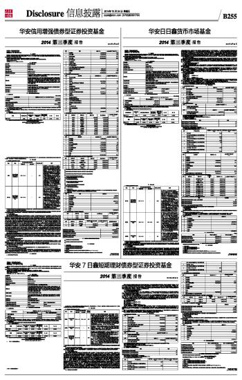 基金管理人:华安基金管理有限公司 基金托管人:中国建设银行股份有限公司 报告送出日期: 二〇一四年十月二十四日 §1 重要提示 基金管理人的董事会及董事保证本报告所载资料不存在虚假记载、误导性陈述或重大遗漏,并对其内容的真实性、准确性和完整性承担个别及连带责任。 基金托管人中国建设银行股份有限公司根据本基金合同规定,于2014年10月20日复核了本报告中的财务指标、净值表现和投资组合报告等内容,保证复核内容不存在虚假记载、误导性陈述或者重大遗漏。 基金管理人承诺以诚实信用、勤勉尽责的原则管理和运用基金资产,但不保证基金一定盈利。 基金的过往业绩并不代表其未来表现。投资有风险,投资者在作出投资决策前应仔细阅读本基金的招募说明书。 本报告中财务资料未经审计。 本报告期自2014年7月1日起至9月30日止。 §2 基金产品概况 ■ §3 主要财务指标和基金净值表现 3.1 主要财务指标 单位:人民币元 ■ 注:本期已实现收益指基金本期利息收入、投资收益、其他收入(不含公允价值变动收益)扣除相关费用后的余额,本期利润为本期已实现收益加上本期公允价值变动收益,由于货币市场基金采用摊余成本法核算,因此,公允价值变动收益为零,本期已实现收益和本期利润的金额相等。 3.2 基金净值表现 3.2.1 本报告期基金份额净值收益率及其与同期业绩比较基准收益率的比较 1.华安7日鑫短期理财债券A: ■ 2.华安7日鑫短期理财债券B: ■ 3.2.2 自基金合同生效以来基金份额累计净值收益率变动及其与同期业绩比较基准收益率变动的比较 华安7日鑫短期理财债券型证券投资基金 份额累计净值收益率与业绩比较基准收益率历史走势对比图 (2012年12月26日至2014年9月30日) 1、 华安7日鑫短期理财债券A ■ 2、华安7日鑫短期理财债券B ■ 注:根据《华安7日鑫短期理财债券型证券投资基金基金合同》,本基金建仓期为14个交易日。基金管理人已自基金合同生效之日起14个交易日内使基金的投资组合比例符合基金合同的有关约定。 §4 管理人报告 4.1 基金经理(或基金经理小组)简介 ■ 注:此处的任职日期和离任日期均指公司作出决定之日,即以公告日为准。证券从业的含义遵从行业协会《证券业从业人员资格管理办法》的相关规定。 4.2 报告期内本基金运作遵规守信情况说明 本报告期内,本基金管理人严格遵守《证券投资基金法》等有关法律法规及基金合同、招募说明书等有关基金法律文件的规定,本着诚实信用、勤勉尽责的原则管理和运用基金资产,在控制风险的前提下,为基金份额持有人谋求最大利益,不存在违法违规或未履行基金合同承诺的情形。 4.3 公平交易专项说明 4.3.1 公平交易制度的执行情况 根据中国证监会《证券投资基金管理公司公平交易制度指导意见》,公司制定了《华安基金管理有限公司公平交易管理制度》,将封闭式基金、开放式基金、特定客户资产管理组合及其他投资组合资产在研究分析、投资决策、交易执行等方面全部纳入公平交易管理中。控制措施包括:在研究环节,研究员在为公司管理的各类投资组合提供研究信息、投资建议过程中,使用晨会发言、发送邮件、登录在研究报告管理系统中等方式来确保各类投资组合经理可以公平享有信息获取机会。在投资环节,公司各投资组合经理根据投资组合的风格和投资策略,制定并严格执行交易决策规则,以保证各投资组合交易决策的客观性和独立性。同时严格执行投资决策委员会、投资总监、投资组合经理等各投资决策主体授权机制,投资组合经理在授权范围内自主决策,超过投资权限的操作需要经过严格的审批程序。在交易环节,公司实行强制公平交易机制,确保各投资组合享有公平的交易执行机会。(1) 交易所二级市场业务,遵循价格优先、时间优先、比例分配、综合平衡的控制原则,实现同一时间下达指令的投资组合在交易时机上的公平性。(2) 交易所一级市场业务,投资组合经理按意愿独立进行业务申报,集中交易部以投资组合名义对外进行申报。若该业务以公司名义进行申报与中签,则按实际中签情况以价格优先、比例分配原则进行分配。若中签量过小无法合理进行比例分配,且以公司名义获得,则投资部门在合规监察员监督参与下,进行公平协商分配。(3) 银行间市场业务遵循指令时间优先原则,先到先询价的控制原则。通过内部共同的iwind群,发布询价需求和结果,做到信息公开。若是多个投资组合进行一级市场投标,则各投资组合经理须以各投资组合名义向集中交易部下达投资意向,交易员以此进行投标,以确保中签结果与投资组合投标意向一一对应。若中签量过小无法合理进行比例分配,且以公司名义获得,则投资部门在合规监察员监督参与下,进行公平协商分配。交易监控、分析与评估环节,公司合规监察稽核部对公司旗下的各投资组合投资境内证券市场上市交易的投资品种、进行场外的非公开发行股票申购、以公司名义进行的债券一级市场申购、不同投资组合同日和临近交易日的反向交易以及可能导致不公平交易和利益输送的异常交易行为进行监控;风险管理部根据市场公认的第三方信息(如:中债登的债券估值),定期对各投资组合与交易对手之间议价交易的交易价格公允性进行审查,对不同投资组合临近交易日的同向交易的交易时机