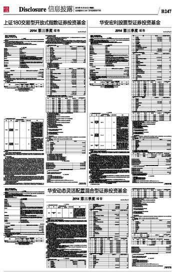 基金管理人:华安基金管理有限公司 基金托管人:中国建设银行股份有限公司 报告送出日期: 二〇一四年十月二十四日 §1 重要提示 基金管理人的董事会及董事保证本报告所载资料不存在虚假记载、误导性陈述或重大遗漏,并对其内容的真实性、准确性和完整性承担个别及连带责任。 基金托管人中国建设银行股份有限公司根据本基金合同规定,于2014年10月22日复核了本报告中的财务指标、净值表现和投资组合报告等内容,保证复核内容不存在虚假记载、误导性陈述或者重大遗漏。 基金管理人承诺以诚实信用、勤勉尽责的原则管理和运用基金资产,但不保证基金一定盈利。 基金的过往业绩并不代表其未来表现。投资有风险,投资者在作出投资决策前应仔细阅读本基金的招募说明书。 本报告中财务资料未经审计。 本报告期自2014年7月1日起至9月30日止。 §2 基金产品概况 ■ §3 主要财务指标和基金净值表现 3.1 主要财务指标 单位:人民币元 ■ 注:1、所述基金业绩指标不包括持有人认购或交易基金的各项费用,计入费用后实际收益水平要低于所列数字。 2、本期已实现收益指基金本期利息收入、投资收益、其他收入(不含公允价值变动收益)扣除相关费用后的余额,本期利润为本期已实现收益加上本期公允价值变动收益。 3.2 基金净值表现 3.2.1 本报告期基金份额净值增长率及其与同期业绩比较基准收益率的比较 ■ 3.2.2 自基金合同生效以来基金份额累计净值增长率变动及其与同期业绩比较基准收益率变动的比较 上证180交易型开放式指数证券投资基金 份额累计净值增长率与业绩比较基准收益率历史走势对比图 (2006年4月13日至2014年9月30日) ■ §4 管理人报告 4.1 基金经理(或基金经理小组)简介 ■ 注:此处的任职日期和离任日期均指公司作出决定之日,即以公告日为准。证券从业的含义遵从行业协会《证券业从业人员资格管理办法》的相关规定。 4.2 管理人对报告期内本基金运作遵规守信情况的说明 本报告期内,本基金管理人严格遵守《证券投资基金法》等有关法律法规及基金合同、招募说明书等有关基金法律文件的规定,本着诚实信用、勤勉尽责的原则管理和运用基金资产,在控制风险的前提下,为基金份额持有人谋求最大利益,不存在违法违规或未履行基金合同承诺的情形。 4.3 公平交易专项说明 4.3.1 公平交易制度的执行情况 根据中国证监会《证券投资基金管理公司公平交易制度指导意见》,公司制定了《华安基金管理有限公司公平交易管理制度》,将封闭式基金、开放式基金、特定客户资产管理组合及其他投资组合资产在研究分析、投资决策、交易执行等方面全部纳入公平交易管理中。控制措施包括:在研究环节,研究员在为公司管理的各类投资组合提供研究信息、投资建议过程中,使用晨会发言、发送邮件、登录在研究报告管理系统中等方式来确保各类投资组合经理可以公平享有信息获取机会。在投资环节,公司各投资组合经理根据投资组合的风格和投资策略,制定并严格执行交易决策规则,以保证各投资组合交易决策的客观性和独立性。同时严格执行投资决策委员会、投资总监、投资组合经理等各投资决策主体授权机制,投资组合经理在授权范围内自主决策,超过投资权限的操作需要经过严格的审批程序。在交易环节,公司实行强制公平交易机制,确保各投资组合享有公平的交易执行机会。(1) 交易所二级市场业务,遵循价格优先、时间优先、比例分配、综合平衡的控制原则,实现同一时间下达指令的投资组合在交易时机上的公平性。(2) 交易所一级市场业务,投资组合经理按意愿独立进行业务申报,集中交易部以投资组合名义对外进行申报。若该业务以公司名义进行申报与中签,则按实际中签情况以价格优先、比例分配原则进行分配。若中签量过小无法合理进行比例分配,且以公司名义获得,则投资部门在合规监察员监督参与下,进行公平协商分配。(3) 银行间市场业务遵循指令时间优先原则,先到先询价的控制原则。通过内部共同的iwind群,发布询价需求和结果,做到信息公开。若是多个投资组合进行一级市场投标,则各投资组合经理须以各投资组合名义向集中交易部下达投资意向,交易员以此进行投标,以确保中签结果与投资组合投标意向一一对应。若中签量过小无法合理进行比例分配,且以公司名义获得,则投资部门在合规监察员监督参与下,进行公平协商分配。交易监控、分析与评估环节,公司合规监察稽核部对公司旗下的各投资组合投资境内证券市场上市交易的投资品种、进行场外的非公开发行股票申购、以公司名义进行的债券一级市场申购、不同投资组合同日和临近交易日的反向交易以及可能导致不公平交易和利益输送的异常交易行为进行监控;风险管理部根据市场公认的第三方信息(如:中债登的债券估值),定期对各投资组合与交易对手之间议价交易的交易价格公允性进行审查,对不同投资组合临近交易日的同向交易的交易时机和交易价差进行分析。 本报告期内,公司公平交易制度总体执行情况良好。 4.3.2 异常交易行为的专项说明 根据中国证监会《证券投资基金管理公司公平交易制度指导意见》,公司合规监察稽核部会同基金投资、交易部门讨论制定了公募基金、专户针对股票、债券、回购等投资品种在交易所及银行