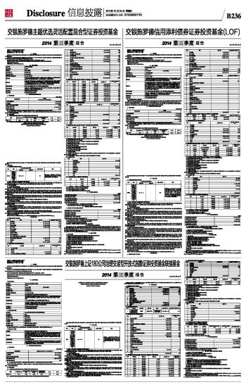基金管理人:交银施罗德基金管理有限公司 基金托管人:中国农业银行股份有限公司 报告送出日期:二〇一四年十月二十四日 §1 重要提示 基金管理人的董事会及董事保证本报告所载资料不存在虚假记载、误导性陈述或重大遗漏,并对其内容的真实性、准确性和完整性承担个别及连带责任。 基金托管人中国农业银行股份有限公司根据本基金合同规定,于2014年10月23日复核了本报告中的财务指标、净值表现和投资组合报告等内容,保证复核内容不存在虚假记载、误导性陈述或者重大遗漏。 基金管理人承诺以诚实信用、勤勉尽责的原则管理和运用基金资产,但不保证基金一定盈利。 基金的过往业绩并不代表其未来表现。投资有风险,投资者在作出投资决策前应仔细阅读本基金的招募说明书。 本报告中财务资料未经审计。 本报告期自2014年7月1日起至9月30日止。 §2 基金产品概况 2.1基金基本情况 ■ 2.1.1目标基金基本情况 ■ 注:本表所列的基金主代码510010为目标基金的二级市场交易代码,目标基金的一级市场申购赎回代码为510011。 2.1.2目标基金产品说明 ■ §3 主要财务指标和基金净值表现 3.1 主要财务指标 单位:人民币元 ■ 注:1、上述基金业绩指标不包括持有人认购或交易基金的各项费用,计入费用后的实际收益水平要低于所列数字; 2、本期已实现收益指基金本期利息收入、投资收益、其他收入(不含公允价值变动收益)扣除相关费用后的余额,本期利润为本期已实现收益加上本期公允价值变动收益。 3.2 基金净值表现 3.2.1 本报告期基金份额净值增长率及其与同期业绩比较基准收益率的比较 ■ 3.2.2 自基金合同生效以来基金份额累计净值增长率变动及其与同期业绩比较基准收益率变动的比较 交银施罗德上证180公司治理交易型开放式指数证券投资基金联接基金 份额累计净值增长率与业绩比较基准收益率历史走势对比图 (2009年9月29日至2014年9月30日) ■ 注:本基金建仓期为自基金合同生效日起的3个月。截至建仓期结束,本基金各项资产配置比例符合基金合同及招募说明书有关投资比例的约定。 §4 管理人报告 4.1 基金经理(或基金经理小组)简介 ■ 4.2 管理人对报告期内本基金运作遵规守信情况的说明 在报告期内,本基金管理人严格遵循了《中华人民共和国证券投资基金法》、基金合同和其他相关法律法规的规定,并本着诚实信用、勤勉尽责的原则管理和运用基金资产,基金投资管理符合有关法律法规和基金合同的规定,为基金持有人谋求最大利益。 4.3 公平交易专项说明 4.3.1 公平交易制度的执行情况 本公司制定了严格的投资控制制度和公平交易监控制度来保证旗下基金运作的公平,旗下所管理的所有资产组合,包括证券投资基金和特定客户资产管理专户均严格遵循制度进行公平交易。 公司建立资源共享的投资研究信息平台,确保各投资组合在获得投资信息、投资建议和实施投资决策方面享有公平的机会。公司在交易执行环节实行集中交易制度,建立公平的交易分配制度。对于交易所公开竞价交易,遵循“时间优先、价格优先、比例分配”的原则,全部通过交易系统进行比例分配;对于非集中竞价交易、以公司名义进行的场外交易,遵循“价格优先、比例分配”的原则按事前独立确定的投资方案对交易结果进行分配。 公司中央交易室和风险管理部进行日常投资交易行为监控,风险管理部负责对各账户公平交易进行事后分析,于每季度和每年度分别对公司管理的不同投资组合的整体收益率差异、分投资类别的收益率差异以及不同时间窗口同向交易的交易价差进行分析,通过分析评估和信息披露来加强对公平交易过程和结果的监督。 报告期内本公司严格执行公平交易制度,公平对待旗下各投资组合,未发现任何违反公平交易的行为。 4.3.2 异常交易行为的专项说明 本基金于本报告期内不存在异常交易行为。本报告期内,本公司管理的所有投资组合参与的交易所公开竞价同日反向交易成交较少的单边交易量没有超过该证券当日总成交量5%的情形,本基金与本公司管理的其他投资组合在不同时间窗下(如日内、3日内、5日内)同向交易的交易价差未出现异常。 4.4 报告期内基金的投资策略和运作分析 2014年第三季度,国内经济增速整体企稳,流动性宽松,各项改革出现加速迹象。在这种经济环境下,资本市场中无论是周期蓝筹股还是中小市值股均一定程度上受益,总体反应积极。本基金为跟踪基准指数的指数基金,在本季度内获得较为可喜的上涨。 展望未来,在微刺激的经济政策背景下,预计货币政策仍将保持相对稳定,经济增速较为平稳,股市在温和的外部环境下预计整体风险不大。在整体政策着力于改革与结构调整的大趋势下,市场或将进入良性可持续的发展阶段。 4.5报告期内基金的业绩表现 截至2014年9月30日,本基金份额净值为0.768元,本报告期份额净值增长率为12.61%,同期业绩比较基准增长率为10.97%。本报告期内本基金的日均跟踪偏离度为0.08%,跟踪误差为0.12%。 §5 投资组合报告 5.1 报告期末基金资产组合情况 ■ 5.2 期末投资目标基金明细 ■ 5.3 报告期末按行业分类的股票投资组合 ■ 5.4 报告期末按公允价值占基金资产净值比例大小排序的前十名股票投资明细 ■ 5.5 报告期末按债券品种分类的债券投资组合 ■ 5.6 报告期末按公允价值占基金资