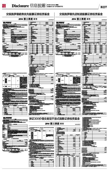 基金管理人:交银施罗德基金管理有限公司 基金托管人:中国农业银行股份有限公司 报告送出日期:二〇一四年十月二十四日 §1 重要提示 基金管理人的董事会及董事保证本报告所载资料不存在虚假记载、误导性陈述或重大遗漏,并对其内容的真实性、准确性和完整性承担个别及连带责任。 基金托管人中国农业银行股份有限公司根据本基金合同规定,于2014年10月23日复核了本报告中的财务指标、净值表现和投资组合报告等内容,保证复核内容不存在虚假记载、误导性陈述或者重大遗漏。 基金管理人承诺以诚实信用、勤勉尽责的原则管理和运用基金资产,但不保证基金一定盈利。 基金的过往业绩并不代表其未来表现。投资有风险,投资者在作出投资决策前应仔细阅读本基金的招募说明书。 本报告中财务资料未经审计。 本报告期自2014年7月1日起至9月30日止。 §2 基金产品概况 ■ 注:本基金场内简称为“深价值”。 §3 主要财务指标和基金净值表现 3.1 主要财务指标 单位:人民币元 ■ 注:1、上述基金业绩指标不包括持有人认购或交易基金的各项费用,计入费用后的实际收益水平要低于所列数字; 2、本期已实现收益指基金本期利息收入、投资收益、其他收入(不含公允价值变动收益)扣除相关费用后的余额,本期利润为本期已实现收益加上本期公允价值变动收益。 3.2 基金净值表现 3.2.1本报告期基金份额净值增长率及其与同期业绩比较基准收益率的比较 ■ 3.2.2自基金合同生效以来基金份额累计净值增长率变动及其与同期业绩比较基准收益率变动的比较 深证300价值交易型开放式指数证券投资基金 份额累计净值增长率与业绩比较基准收益率历史走势对比图 (2011年9月22日至2014年9月30日) ■ 注:本基金建仓期为自基金合同生效日起的3个月。截至建仓期结束,本基金各项资产配置比例符合基金合同及招募说明书有关投资比例的约定。 §4 管理人报告 4.1 基金经理(或基金经理小组)简介 ■ 4.2 管理人对报告期内本基金运作遵规守信情况的说明 在报告期内,本基金管理人严格遵循了《中华人民共和国证券投资基金法》、基金合同和其他相关法律法规的规定,并本着诚实信用、勤勉尽责的原则管理和运用基金资产,基金投资管理符合有关法律法规和基金合同的规定,为基金持有人谋求最大利益。 4.3 公平交易专项说明 4.3.1公平交易制度的执行情况 本公司制定了严格的投资控制制度和公平交易监控制度来保证旗下基金运作的公平,旗下所管理的所有资产组合,包括证券投资基金和特定客户资产管理专户均严格遵循制度进行公平交易。 公司建立资源共享的投资研究信息平台,确保各投资组合在获得投资信息、投资建议和实施投资决策方面享有公平的机会。公司在交易执行环节实行集中交易制度,建立公平的交易分配制度。对于交易所公开竞价交易,遵循“时间优先、价格优先、比例分配”的原则,全部通过交易系统进行比例分配;对于非集中竞价交易、以公司名义进行的场外交易,遵循“价格优先、比例分配”的原则按事前独立确定的投资方案对交易结果进行分配。 公司中央交易室和风险管理部进行日常投资交易行为监控,风险管理部负责对各账户公平交易进行事后分析,于每季度和每年度分别对公司管理的不同投资组合的整体收益率差异、分投资类别的收益率差异以及不同时间窗口同向交易的交易价差进行分析,通过分析评估和信息披露来加强对公平交易过程和结果的监督。 报告期内本公司严格执行公平交易制度,公平对待旗下各投资组合,未发现任何违反公平交易的行为。 4.3.2异常交易行为的专项说明 本基金于本报告期内不存在异常交易行为。本报告期内,本公司管理的所有投资组合参与的交易所公开竞价同日反向交易成交较少的单边交易量没有超过该证券当日总成交量5%的情形,本基金与本公司管理的其他投资组合在不同时间窗下(如日内、3日内、5日内)同向交易的交易价差未出现异常。 4.4 报告期内基金的投资策略和运作分析 2014年第三季度,国内经济增速整体企稳,流动性宽松,各项改革出现加速迹象。在这种经济环境下,资本市场中无论是周期蓝筹股还是中小市值股均一定程度上受益,总体反应积极。本基金为跟踪基准指数的指数基金,在本季度内获得较为可喜的上涨。 展望未来,在微刺激的经济政策背景下,预计货币政策仍将保持相对稳定,经济增速较为平稳,股市在温和的外部环境下预计整体风险不大。在整体政策着力于改革与结构调整的大趋势下,市场或将进入良性可持续的发展阶段。 4.5 报告期内基金的业绩表现 截至2014年9月30日,本基金份额净值为1.021元,本报告期份额净值增长率为15.11%,同期业绩比较基准增长率为14.82%。本报告期内本基金的日均跟踪偏离度为0.04%,跟踪误差为0.05%。 §5 投资组合报告 5.1 报告期末基金资产组合情况 ■ ■ 5.2 报告期末按行业分类的股票投资组合 5.2.1 积极投资按行业分类的股票投资组合 本基金本报告期末未持有积极投资的股票。 5.2.2 指数投资按行业分类的股票投资组合 ■ 5.3 报告期末按公允价值占基金资产净值比例大小的股票投资明细 5.3.1 报告期末指数投资按公允价值占基金资产净值比例大小排序的前十名股票投资明细 ■ 5.3.2 报告期末积极投资按公允价值占基金资产净值比例大小排序的前五