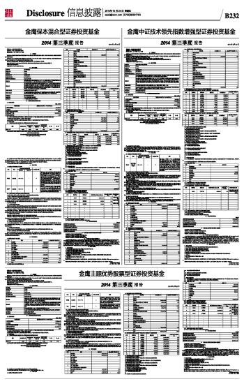 基金管理人:金鹰基金管理有限公司 基金托管人:中国工商银行股份有限公司 报告送出日期: 二〇一四年十月二十四日 §1 重要提示 基金管理人的董事会及董事保证本报告所载资料不存在虚假记载、误导性陈述或重大遗漏,并对其内容的真实性、准确性和完整性承担个别及连带责任。 基金托管人中国工商银行股份有限公司根据本基金合同规定,于2014年10月21日复核了本报告中的财务指标、净值表现和投资组合报告等内容,保证复核内容不存在虚假记载、误导性陈述或者重大遗漏。 基金管理人承诺以诚实信用、勤勉尽责的原则管理和运用基金资产,但不保证基金一定盈利。 基金的过往业绩并不代表其未来表现。投资有风险,投资者在作出投资决策前应仔细阅读本基金的招募说明书。 本报告中财务资料未经审计。 本报告期自2014年7月1日起至9月30日止。 §2 基金产品概况 ■ §3 主要财务指标和基金净值表现 3.1 主要财务指标 单位:人民币元 ■ 注:1、本期已实现收益指基金本期利息收入、投资收益、其他收入(不含公允价值变动收益)扣除相关费用后的余额; 2、本期利润为本期已实现收益加上本期公允价值变动收益; 3、基金业绩指标不包括持有人认购或交易基金的各项费用,计入费用后实际收益水平要低于所列数字。 3.2 基金净值表现 3.2.1 本报告期基金份额净值增长率及其与同期业绩比较基准收益率的比较 ■ 3.2.2自基金合同生效以来基金累计份额净值增长率变动及其与同期业绩比较基准收益率变动的比较 金鹰保本混合型证券投资基金 累计份额净值增长率与业绩比较基准收益率的历史走势对比图 (2011年5月17日至2014年9月30日) ■ 注:1、截至报告日本基金各项投资比例符合基金合同规定的各项比例,即股票、权证占基金资产净值的比例为0%~40%,其中,权证投资的比例范围占基金资产净值的0%~3%;债券、资产支持证券、货币市场工具、现金以及法律法规或中国证监会允许基金投资的其他金融工具占基金资产净值的60%~100%,其中,现金或到期日在一年以内的政府债券不低于基金资产净值的5%; 2、本基金的业绩比较基准为:3年期银行定期存款利率(税后)。 §4 管理人报告 4.1 基金经理(或基金经理小组)简介 ■ 注:1、任职日期和离任日期指公司公告聘任或解聘日期; 2、证券从业的含义遵从行业协会《证券业从业人员资格管理办法》的相关规定。 4.2 管理人对报告期内本基金运作遵规守信情况的说明 本报告期内,本基金管理人严格遵守《证券投资基金法》和其他有关法律法规及其各项实施准则、《金鹰保本混合型证券投资基金基金合同》的规定,本着诚实信用、勤勉尽责的原则管理和运用基金资产,在严格控制风险的基础上,为基金份额持有人谋求最大利益。本报告期内,基金运作合法合规,无出现重大违法违规或违反基金合同的行为,无损害基金份额持有人利益的行为。 4.3 公平交易专项说明 4.3.1 公平交易制度的执行情况 本报告期,本基金管理人按照《证券投资基金管理公司公平交易制度指导意见》的要求,根据本公司《公平交易制度》的规定,通过规范化的投资、研究和交易流程,确保公平对待不同投资组合,切实防范利益输送。 本基金管理人事前规定了严格的股票备选库管理制度、投资权限管理制度、债券库管理制度和集中交易制度等;事中重视交易执行环节的公平交易措施,以"时间优先、价格优先"作为执行指令的基本原则,必要时启用投资交易系统中的公平交易模块;事后加强对不同投资组合的交易价差、收益率的分析,以尽可能确保公平对待各投资组合。本报告期内,公司公平交易制度总体执行情况良好。 4.3.2 异常交易行为的专项说明 本报告期内,未发现本基金有可能导致不公平交易和利益输送的异常交易。 本报告期内,本投资组合与本公司管理的其他主动型投资组合未发生过同日反向交易的情况;与本公司管理的被动型投资组合发生的同日反向交易,未发生过成交较少的单边交易量超过该证券当日成交量的5%的情况。 4.4 报告期内基金的投资策略和业绩表现说明 4.4.1 报告期内基金投资策略和运作分析 2014年三季度债券市场收益率下降为主,长期限债券收益率下降明显,而短端收益率变动不大,5年期AA评级城投债收益率下降40BP左右,10年政策性金融债下降30BP左右。由于金鹰保本基金在三季度进入一个新的保本期,在三季度的建仓中逐步买入了中高等级信用债,权益类投资较少。 4.4.2 报告期内基金的业绩表现 截至2014年9月30日,基金份额净值为1.023元,本报告期份额净值增长率为2.3%,同期业绩比较基准增长率为1.09%。 4.5 管理人对宏观经济、证券市场及行业走势的简要展望 我们认为未来宏观经济下行压力仍然较大,债券市场收益率大幅上行的概率较小,资金面相对宽松的背景下中高等级信用债有不错的持有价值,但是我们对低评级债券持规避态度,尤其是低等级以及产能过剩行业产业债,低评级债券监管的趋严以及持续爆出的信用事件将使低等级信用利差难以明显收窄。 §5 投资组合报告 5.1 报告期末基金资产组合情况 ■ 5.2 报告期末按行业分类的股票投资组合 ■ 5.3 报告期末按公允价值占基金资产净值比例大小排序的前十名股票投资明细 ■ 注:本基金本报告期末仅持有4只股票。 5.4 报告期末按债券品种分类的债券投资组合 ■ 5.5 报告期末按公