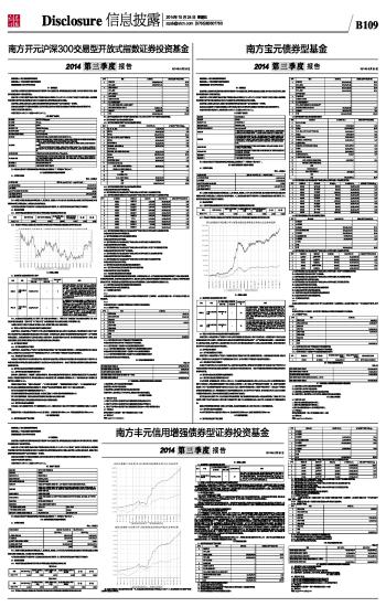 基金管理人:南方基金管理有限公司 基金托管人:中国工商银行股份有限公司 报告送出日期:2014年10月24日 §1 重要提示 基金管理人的董事会及董事保证本报告所载资料不存在虚假记载、误导性陈述或重大遗漏,并对其内容的真实性、准确性和完整性承担个别及连带责任。 基金托管人中国工商银行股份有限公司根据本基金合同规定,于2014年10月22日复核了本报告中的财务指标、净值表现和投资组合报告等内容,保证复核内容不存在虚假记载、误导性陈述或者重大遗漏。 基金管理人承诺以诚实信用、勤勉尽责的原则管理和运用基金资产,但不保证基金一定盈利。 基金的过往业绩并不代表其未来表现。投资有风险,投资者在作出投资决策前应仔细阅读本基金的招募说明书。 本报告中财务资料未经审计。 本报告期自2014年7月1日起至2014年9月30日止。 §2 基金产品概况 ■ 注:本基金在交易所行情系统净值揭示等其他信息披露场合下,可简称为“南方300”。 §3 主要财务指标和基金净值表现 3.1 主要财务指标 单位:人民币元 ■ 注:1.本期已实现收益指基金本期利息收入、投资收益、其他收入(不含公允价值变动收益)扣除相关费用后的余额,本期利润为本期已实现收益加上本期公允价值变动收益。 2.所述基金业绩指标不包括持有人认购或交易基金的各项费用,计入费用后实际收益水平要低于所列数字。 3.2 基金净值表现 3.2.1 本报告期基金份额净值增长率及其与同期业绩比较基准收益率的比较 ■ 3.2.2 自基金合同生效以来基金累计净值增长率变动及其与同期业绩比较基准收益率变动的比较 ■ §4 管理人报告 4.1 基金经理(或基金经理小组)简介 ■ 注:1、对基金的首任基金经理,其“任职日期”为基金合同生效日,“离职日期”为根据公司决定确定的解聘日期,对此后的非首任基金经理,“任职日期”和“离任日期”分别指根据公司决定确定的聘任日期和解聘日期。 2.证券从业的含义遵从行业协会《证券业从业人员资格管理办法》的相关规定。 4.2 管理人对报告期内本基金运作遵规守信情况的说明 本报告期内,本基金管理人严格遵守《中华人民共和国证券投资基金法》等有关法律法规、中国证监会和《南方开元沪深300交易型开放式指数证券投资基金基金合同》的规定,本着诚实信用、勤勉尽责的原则管理和运用基金资产,在严格控制风险的基础上,为基金份额持有人谋求最大利益。本报告期内,基金运作整体合法合规,没有损害基金份额持有人利益。基金的投资范围、投资比例及投资组合符合有关法律法规及基金合同的规定。 4.3 公平交易专项说明 4.3.1 公平交易制度的执行情况 本报告期内,本基金管理人严格执行《证券投资基金管理公司公平交易制度指导意见》,完善相应制度及流程,通过系统和人工等各种方式在各业务环节严格控制交易公平执行,公平对待旗下管理的所有基金和投资组合。 4.3.2 异常交易行为的专项说明 本基金于本报告期内不存在异常交易行为。本报告期内基金管理人管理的所有投资组合参与的交易所公开竞价同日反向交易成交较少的单边交易量超过该证券当日成交量的5%的交易次数为2次,是由于指数型基金根据标的指数成份股结构被动调仓所致。 4.4 报告期内基金的投资策略和业绩表现说明 4.4.1 报告期内基金投资策略和运作分析 报告期内,随着稳增长、“微刺激”政策的持续出台,经济企稳质量将得到明显改善,短期经济数据反复并不改变市场反弹走势。年底前沪港通即将开通,海外资金将加大对A股的配置力度,市场底部支撑较为扎实,个股和板块机会不断涌现,期间沪深300指数涨13.20%。 期间我们通过自建的“指数化交易系统”、“日内择时交易模型”、“跟踪误差归因分析系统”、“ETF现金流精算系统”等,将本基金的跟踪误差指标控制在较好水平,并通过严格的风险管理流程,确保了本ETF基金的安全运作。 我们对本基金报告期内跟踪误差归因分析如下: ①大额申购赎回带来的成份股权重偏差,对此我们通过日内择时交易争取跟踪误差最小化; ②个别长期停牌证券,引起的成份股权重偏离及基金整体仓位的微小偏离; ③股指期货和现货之间的基差波动带来的本基金与基准的偏离。 4.4.2 报告期内基金的业绩表现 自本基金上市以来至报告期末,年化跟踪误差为0.542%,较好的完成了基金合同中控制年化跟踪误差不超过2%的投资目标。 截至报告期末,本基金份额净值为0.9723元,报告期内, 份额净值增长率为14.52%,同期业绩基准增长率为13.20%。 §5 投资组合报告 5.1 报告期末基金资产组合情况 ■ 注:上表中的股票投资项含可退替代款估值增值,而5.2的合计项中不含可退替代款估值增值。 5.2 报告期末按行业分类的股票投资组合 5.2.1 报告期末指数投资按行业分类的股票投资组合 ■ 5.2.2 报告期末积极投资按行业分类的股票投资组合 本基金本报告期末未持有积极投资。 5.3 报告期末按公允价值占基金资产净值比例大小排序的前十名股票投资明细 5.3.1 报告期末指数投资按公允价值占基金资产净值比例大小排序的前十名股票投资明细 ■ 5.3.2 报告期末积极投资按公允价值占基金资产净值比例大小排序的前五名股票投资明细 本基金本报告期末未持有积极投资。 5.4 报告期末按债券品种分类的债券投资组合 本基金本报告期末未持有债券。 5.