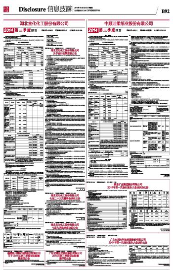 五、证券投资情况 □ 适用 √ 不适用 公司报告期不存在证券投资。 持有其他上市公司股权情况的说明 □ 适用 √ 不适用 公司报告期未持有其他上市公司股权。 中顺洁柔纸业股份有限公司 董事长:邓颖忠 2014年10月24日 本版导读: