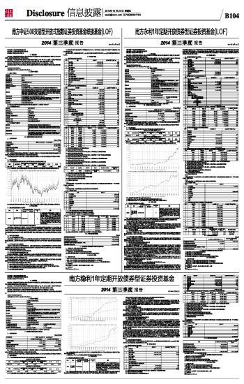 基金管理人:南方基金管理有限公司 基金托管人:中国农业银行股份有限公司 报告送出日期:2014年10月24日 §1 重要提示 基金管理人的董事会及董事保证本报告所载资料不存在虚假记载、误导性陈述或重大遗漏,并对其内容的真实性、准确性和完整性承担个别及连带责任。 基金托管人中国农业银行股份有限公司根据本基金合同规定,于2014年10月22日复核了本报告中的财务指标、净值表现和投资组合报告等内容,保证复核内容不存在虚假记载、误导性陈述或者重大遗漏。 基金管理人承诺以诚实信用、勤勉尽责的原则管理和运用基金资产,但不保证基金一定盈利。 基金的过往业绩并不代表其未来表现。投资有风险,投资者在作出投资决策前应仔细阅读本基金的招募说明书。 本报告中财务资料未经审计。 本报告期自2014年7月1日起至2014年9月30日止。 §2 基金产品概况 ■ 注:本基金在交易所行情系统净值揭示等其他信息披露场合下,可简称为“南方稳利”。 §3 主要财务指标和基金净值表现 3.1 主要财务指标 单位:人民币元 ■ 注:1、本期已实现收益指基金本期利息收入、投资收益、其他收入(不含公允价值变动收益)扣除相关费用后的余额,本期利润为本期已实现收益加上本期公允价值变动收益; 2、所述基金业绩指标不包括持有人认购或交易基金的各项费用,计入费用后实际收益水平要低于所列数字。 3.2 基金净值表现 3.2.1 本报告期基金份额净值增长率及其与同期业绩比较基准收益率的比较 南方稳利1年定期开放债券A ■ 南方稳利1年定期开放债券C ■ 3.2.2 自基金合同生效以来基金累计净值增长率变动及其与同期业绩比较基准收益率变动的比较 ■ 注:1.本基金的基金合同生效日为2013年7月23日。本基金的建仓期为六个月,建仓期结束时各项资产配置比例符合基金合同约定。 2.本基金自2014年7月24日起增加C类收费模式,原有收费模式称为A类。 §4 管理人报告 4.1 基金经理(或基金经理小组)简介 ■ 注:1. 对基金的首任基金经理,其“任职日期”为基金合同生效日,“离任日期”为根据公司决定确定的解聘日期;对此后的非首任基金经理,“任职日期”和“离任日期”分别指根据公司决定确定的聘任日期和解聘日期。 2.证券从业的含义遵从行业协会《证券业从业人员资格管理办法》的相关规定。 4.2 管理人对报告期内本基金运作遵规守信情况的说明 本报告期内,本基金管理人严格遵守《中华人民共和国证券投资基金法》等有关法律法规、中国证监会和《南方稳利1年定期开放债券型证券投资基金基金合同》的规定,本着诚实信用、勤勉尽责的原则管理和运用基金资产,在严格控制风险的基础上,为基金份额持有人谋求最大利益。本报告期内,基金运作整体合法合规,没有损害基金份额持有人利益。基金的投资范围、投资比例及投资组合符合有关法律法规及基金合同的规定。 4.3 公平交易专项说明 4.3.1 公平交易制度的执行情况 本报告期内,本基金管理人严格执行《证券投资基金管理公司公平交易制度指导意见》,完善相应制度及流程,通过系统和人工等各种方式在各业务环节严格控制交易公平执行,公平对待旗下管理的所有基金和投资组合。 4.3.2 异常交易行为的专项说明 本基金于本报告期内不存在异常交易行为。本报告期内基金管理人管理的所有投资组合参与的交易所公开竞价同日反向交易成交较少的单边交易量超过该证券当日成交量的5%的交易次数为2次,是由于指数型基金根据标的指数成份股结构被动调仓所致。 4.4 报告期内基金的投资策略和业绩表现说明 4.4.1 报告期内基金投资策略和运作分析 6月份信贷数据及M2增速显著高于预期,7月份中采制造业PMI创年内新高,使得市场开始预期宽信用带来的经济增速企稳回升,债券市场因此在7月份经历了一定幅度的调整。但是随后8、9月份经济数据转为下行,货币金融数据低于预期,房地产销售持续低迷,实体经济有效需求不足和银行体系风险偏好下降共同导致宽货币向宽信用的传导不畅。CPI从5月份的2.5%连续3个月下行至8月份的2.0%,经济增长和通胀双双向下,构成了债券市场收益率进一步下行的基础。三季度央行两次下调公开市场操作正回购利率,并且适时提供流动性支持加强季末资金面管理,传递出货币政策宽松信号。因此8月份以来债券市场重拾升势,10年国开和10年国债收益率均创年内新低,信用利差进一步下降。 预计四季度实体经济有效需求不足的问题将延续,但9月末央行、银监会发文对房贷政策的放松可能带来地产销售的回暖,缓解未来经济增速的压力。受基数效应影响,CPI同比增速预计呈现低位缓慢回升的局面,但不会超过2.5%,对债市难以构成负面影响。在当前降低社会融资成本的主基调下,预计四季度货币政策将维持定向宽松的基调。在此背景下,债券市场整体风险不大,并具备收益率陡峭化下行的可能。??@ 南方稳利1年定期开放基金于7月24日开放申购赎回,开放前已经大部分变现。8月14日进入下一个运作周期,新增配置以短期信用债和利率债为主,信用债主要获取持有收益,利率债主要是秉承波段操作思路,在8、9月份陆续加仓,为组合贡献了一定资本利得。? 4.4.2 报告期内基金的业绩表现 本报告期南方稳利1年定期开放基金A类净值增长率为1.57%,同期业绩比较基准增长率为1.02%;C类净值增长率为1.08%,