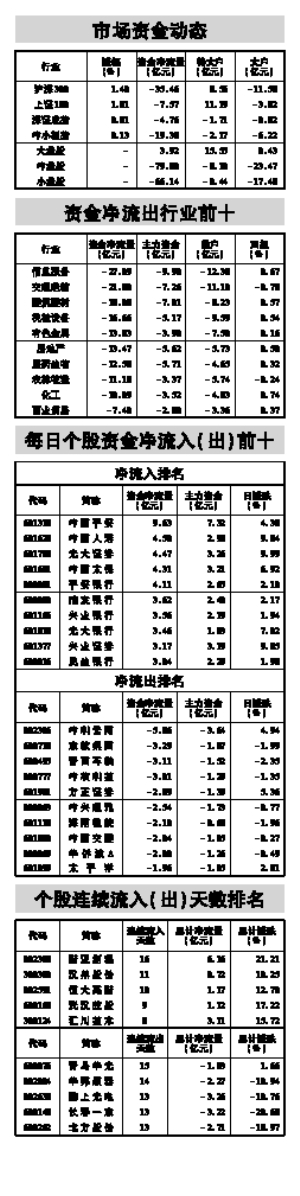 据STCN资金流向快报(http://data.stcn.com/statisticalData.shtml)数据显示,11月26日,沪深两市共流出资金142.02亿元,资金结束昨日的流入状态,转而流出。其中,沪市净流出67.90亿元,深市净流出74.12亿元。主力资金合计流出33.50亿元。 指数方面,上证180指数成份股合计资金流出7.57亿元,深证成指成份股资金流出4.76亿元,沪深300指数成份股资金流出35.46亿元。以股本规模计,流通盘中大盘股资金流入3.92亿元,中盘股资金流出79.80亿元,小盘股资金流出66.14亿元。 行业方面,按照衍生申万一级行业分类计,有4个行业资金净流入,21个行业资金净流出。其中,银行流入资金33.50亿,成为资金最关注的行业;信息服务流出资金27.09 亿,有较明显的资金出逃现象。 保险业已持续5个交易日净流入资金,共流入资金65.99亿,居行业连续流入天数榜首位。交通运输业已持续10个交易日净流出资金,共流出资金64.77亿,为行业连续流出天数榜第一。 新亚制程已持续16个交易日净流入资金,累计流入资金6.16亿,居个股连续流入天数榜首位。青鸟华光已持续15个交易日净流出资金,累计流出资金1.03亿,为个股连续流出天数榜第一。 股指期货方面,IF1412合约收报2745.60点,上涨1.11%;成交124.40万手,持仓量减1206手,收报17.85万手。 (黄舒欣) 本版导读: