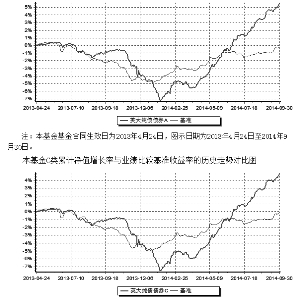 11.5 报告期末前十名股票中存在流通受限情况的说明 本基金本报告期末前十名股票中不存在流通受限情况。 11.6 投资组合报告附注的其他文字描述部分 由于四舍五入的原因,分项之和与合计项之间可能存在尾差。 十二、基金的业绩 基金管理人承诺以恪尽职守、诚实信用、勤勉尽责的原则管理和运用基金财产,但不保证基金一定盈利,也不向投资者保证最低收益。基金的过往业绩并不代表其未来表现。投资有风险,投资者在作出投资决策前应仔细阅读本基金的招募说明书。 1、本基金合同生效日为2013年4月24日,基金合同生效以来(截至2014年9月30日)的投资业绩及同期基准的比较如下表所示: