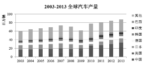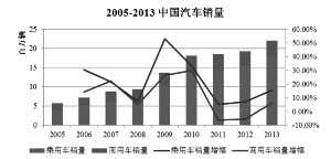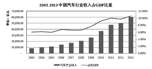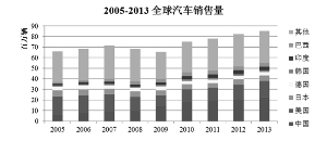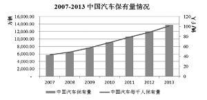 (数据来源:OICA) 自2003年以来,美国、日本的汽车产量始终处于世界前三位。受2008、2009年金融危机影响,美国、日本等发达国家的汽车生产量和占比明显的下降,在2010-2013年经济复苏期间有所恢复,但仍未能达到金融危机前的水平。中国、印度、巴西等发展中国家的汽车产业受金融危机的冲击较小,其产量及占比在近十年中显著提升。尤其是中国,2005年汽车产量处于全球第四位,分别于2006、2008年上升至全球第三位、第二位,2009年超过日本,从此成为全球最大的汽车生产国。2013年,中国生产汽车达到2,211万辆,超过全球总产量的四分之一。 全球汽车销售趋势与汽车生产趋势基本类似。2013年全球汽车销量为8,539万辆,是2005年的1.29倍。除2009年全球汽车产量低于销量外,其余年份的产量均略高于销量。 ■ (数据来源:OICA) 美国和日本作为两大传统汽车生产国,也是传统的汽车销售国,其中美国的汽车销量远高于其汽车产量,是汽车净进口国。美国在金融危机后汽车销量增速高于全球平均水平,稳定了其在全球汽车销售中的占比和地位。除美国外,大部分发达国家的汽车销售的全球占比持续下降。发展中国家在近十年来汽车销售增速基本维持在全球平均增速之上,并逐步扩大市场占比,其中中国从金融危机发生前至今始终保持销售正增长,各年的销量占比与其产量占比基本保持一致,2013年汽车销量达2,198万辆,超过全球四分之一。 ②中国汽车工业发展概况 汽车工业与国民经济存在密切关系。汽车工业具有较强的产业带动力,能够推动国民经济的发展,而国民经济的发展也可以带动汽车工业的增长。随着国民经济持续快速的发展和居民购买力的逐年增强,汽车需求不断增加,中国汽车工业保持了高速增长的态势。2003至2013年,中国汽车行业快速发展,汽车行业收入对我国GDP的贡献也逐年提高,2013年中国汽车行业实现收入60,540亿元人民币,占GDP比重达到10.64%。 ■ (数据来源:国家统计局) 中国的汽车产业在过去近十年经历了快速发展,与世界各国汽车产业相比,中国受金融危机影响较小,并从2005年的世界第四大汽车生产国、第三大汽车销售国发展至2009年的世界最大汽车生产国和销售国,连续五年蝉联全球第一。2013年,中国的汽车产量、销量分别为2,211万辆和2,198万辆,两项数据均超过全球总量的四分之一,显示了中国汽车产业强劲的发展势头和潜力。 ■ (数据来源:OICA) 中国汽车产业发展主要受益于乘用车的快速增长,2013年底中国乘用车销售同比增长15.71%,达到1,792万辆,占汽车总销售量的81.55%,高于全球乘用车销量与总销量的占比73.40%。中国乘用车市场仍有很大潜力和发展空间。 ③世界各国汽车保有量概况 ■ (数据来源:OICA) 根据OICA数据统计,2012年美国汽车保有量和每千人汽车保有量均为世界第一,分别为25,149万辆和每千人791辆;日本2012年汽车保有量和每千人汽车保有量分别为7,612万辆和每千人599辆,其汽车保有量低于中国位列第三,每千人汽车保有量位居世界第二;中国2012年的汽车保有量为10,922万辆,位居世界第二,每千人汽车保有量仅79辆,属于世界较低的水平。截至2013年底中国汽车保有量和每千人汽车保有量已分别超过13,740万辆和每千人100辆。 2007至2013年中国汽车保有量增长趋势如下图所示: ■ (数据来源:Wind资讯)(下转B65版) 本版导读: