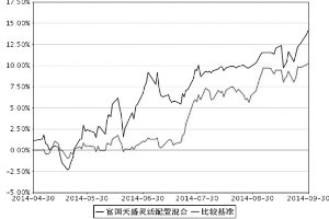 2、自基金合同生效以来富国天盛灵活配置混合型证券投资基金累计份额净值增长率与业绩比较基准收益率的历史走势对比图 ■ 注:1、本图中所示时间区间为2014年4月30日至2014年9月30日,本基金自基金转型日至图表截止日不足一年。 2、本基金于2014年4月30日由原汉盛证券投资基金转型而成,建仓期 6 个月, 截止至本报告期末,本基金尚处于建仓期。 十三、费用概览 (一)基金的费用与税收 1、基金费用的种类 (1) 基金管理人的管理费; (2) 基金托管人的托管费; (3) 基金合同生效后与基金相关的信息披露费用; (4) 基金合同生效后与基金相关的会计师费、律师费、仲裁费和诉讼费; (5) 基金份额持有人大会费用; (6) 基金的证券、期货交易费用; (7) 基金的银行汇划费用; (8) 证券、期货账户开户费用、银行账户维护费用; (9) 按照国家有关规定和基金合同约定,可以在基金财产中列支的其他费用。 2、基金费用计提方法、计提标准和支付方式 (1) 基金管理人的管理费 本基金的管理费按前一日基金资产净值的1.5%年费率计提。管理费的计算方法如下: H=E×1.5%÷当年天数 H为每日应计提的基金管理费 E为前一日的基金资产净值 基金管理费每日计算,逐日累计至每月月末,按月支付,由基金管理人向基金托管人发送基金管理费划款指令,基金托管人复核后于次月前3个工作日内从基金财产中一次性支付给基金管理人。若遇法定节假日、公休假等,支付日期顺延。 (2)基金托管人的托管费 本基金的托管费按前一日基金资产净值的0.25%的年费率计提。托管费的计算方法如下: H=E×0.25%÷当年天数 H为每日应计提的基金托管费 E为前一日的基金资产净值 基金托管费每日计算,逐日累计至每月月末,按月支付,由基金管理人向基金托管人发送基金托管费划款指令,基金托管人复核后于次月前3个工作日内从基金财产中一次性支取。若遇法定节假日、公休日等,支付日期顺延。 上述“1、基金费用的种类中第(3)-(9)项费用”,根据有关法规及相应协议规定,按费用实际支出金额列入当期费用,由基金托管人从基金财产中支付。 3、不列入基金费用的项目 下列费用不列入基金费用: (1) 基金管理人和基金托管人因未履行或未完全履行义务导致的费用支出或基金财产的损失; (2) 基金管理人和基金托管人处理与基金运作无关的事项发生的费用; (3) 基金合同生效前的相关费用; (4) 其他根据相关法律法规及中国证监会的有关规定不得列入基金费用的项目。 4、基金税收 本基金运作过程中涉及的各纳税主体,其纳税义务按国家税收法律、法规执行。 5、基金管理费和基金托管费的调整 基金管理人和基金托管人可协商酌情降低基金管理费和基金托管费,此项调整不需要基金份额持有人大会决议通过。基金管理人必须最迟于新的费率实施日2个工作日前在指定媒体上刊登公告。 (二)与基金销售有关的费用 1、申购费用 投资人申购本基金份额时,需交纳申购费用,费率按申购金额递减。投资人在一天之内如果有多笔申购,适用费率按单笔分别计算。 本基金提供两种申购费用的支付模式,各销售机构采取的支付模式以其业务规定为准: (1)前端收费模式 前端收费模式,即在申购时支付申购费用,该费用按申购金额递减。 本基金前端收费模式对通过直销柜台申购的养老金客户与除此之外的其他投资者实施差别的申购费率。具体如下: A、申购费率