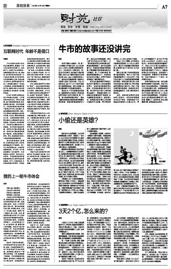 A股进入了大牛市。当然,近期是震荡的牛市。不管怎样,虽然各种股票的大阴线不时冒出来吓人一大跳,主流市况还是每天各种涨停板满天飞。这时,各种不靠谱也来了。 读报可以读到各种股市的故事。我的爱好是读故事。可惜,现在缺少会讲故事的朋友,至少讲故事的人首先要学好数学。 第一个故事,在各网站、微信、微博都见到其流传,讲的是股市的财富效应,说“深圳大户3天赚2亿回家养老”。具体报道是这样的:一位资深业内人士告诉记者,一位深圳大户看准近期大盘走势,融资买入1000万股中银证券和1000万股民生银行股票,3个交易日后,除开融资成本,净赚2个亿。 这里的“中银证券”,应该是中信证券,券商股里只有这个是“中”开头的。我第一直觉是数学上不该出现这种结果。倒不是2亿元的数字大,如果投入10亿元,两个涨停板就赚2亿元了。该文章出炉的时间是上周末,中信证券还没迎来三连涨停,取任何一个区间连续3个交易日,最大涨幅为23%,即12月3日、4日、5日,如果算是2日买入,持股成本大概可以低到18元左右,1000万股的起始市值1.8亿元;民生银行区间涨幅最大的连续3个交易日是12月2日、3日、4日,涨25%,如果1日买入,持股成本大概可以低到7.2元左右,1000万股的起始市值7200万元;综合两只股票的情况,开始的持股市值合计是2.5亿元左右。就算两只股票都3天赚了25%吧,就是6250万元,这数字距离2亿元太远了。那我们把3天收益调高到30%吧,那等于赚了7500万元,还是对不上。 为什么我说第一直觉就是这个数字不对呢?心中对这些股票的股价很熟悉,文中一说持中信证券、民生银行各1000万股,马上就得出深圳这位仁兄仓位大致在2亿至3亿元间。以A股的涨跌停板制度,2亿多元的市值持股不动要3天赚2亿是无法完成的任务。即便是从跌停板拉到涨停板,3天也不够翻倍。何况这两只股票没有这种极端走势,文章说的也是持股三天赚2亿元的故事。 这个故事出来后,有一些报纸的评论版也发了一些文章,无非是说这种故事有些不真实。比如有一位评论家说,如果有人愿意投入一两亿元,以金融股的行情,赚这么多钱也不是不可能的,但只能姑妄听之,股民要理性,成熟,投资有风险,入市须谨慎……反正这些评论文章也是不知所云。 显然,很多人只是被“3天2亿元”这个数字惊到了,或者只是为了反对而反对。在A股市场,数亿元的大户不算怪物,是正常的现象,而数亿元的机构客户在机构投资者里都还算不上大户。只要有投入,在股市3天赚2亿元是很正常的。关键是故事要讲得合理。如果文章把那位深圳大户的持股数量往上面加个几倍,就顺理成章了。 另外一些故事,比如炒股指期货,同样是报道几天时间300万本金赚了1500万,翻了5倍。由于不描述各种细节,那也就合理了。上周,沪深300股指期货合约几天的累计振幅是远不足以赚5倍,但因为期货是T+0,波段做得好,只要文章不说一天操作多少次,几天赚5倍那是完全可能的。 末了,说明两件事:一是别人说什么就是什么,这在股市上是一个不好的习惯。二是写证券市场的稿子,懂点股票、会点数学很重要——首先不会写错股票的名字,也不会说不清楚故事。 本版导读: