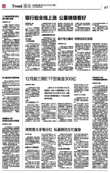 12月前三周ETF狂吸金300亿 2014-12-23 来源:证券时报网 作者:朱景锋