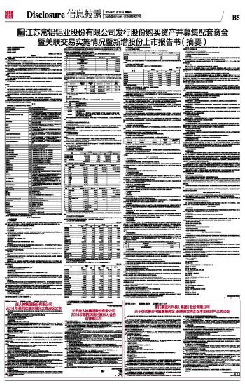 江苏常铝铝业股份有限公司发行股份购买资产并募集配套资金暨关联交易实施情况暨新增股份上市报告书(摘要) 2014-12-25 来源:证券时报网 作者: