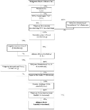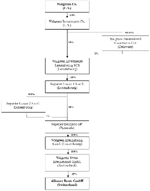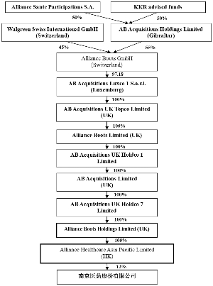 南京医药股份有限公司 简式权益变动报告书 上市公司名称:南京医药股份有限公司 股票上市地点:上海证券交易所 股票简称:南京医药 股票代码:600713 信息披露义务人: Walgreens Boots Alliance, Inc. 住所:c/o Corporation Services Company, 2711 Centerville Road, Suite 400, Wilmington, Delaware, 19808 通讯地址:108 Wilmot Road, Deerfield, Illinois, 60015 签署日期:二〇一五年一月四日 信息披露义务人声明 本部分所述词语或简称与本报告书“释义”所述词语或简称具有相同含义。 一、本报告书系信息披露义务人依据《中华人民共和国公司法》、《中华人民共和国证券法》、《上市公司收购管理办法》、《公开发行证券的公司信息披露内容与格式准则第 15 号——权益变动报告书》及其他相关法律、法规及部门规章的有关规定编写。 二、信息披露义务人签署本报告书已获得必要的授权和批准。 三、依据《中华人民共和国证券法》和《上市公司收购管理办法》的规定,本报告书已全面披露信息披露义务人在南京医药中拥有权益的股份变动情况;截至本报告书签署之日,除本报告书披露的信息外,信息披露义务人没有通过任何其他方式增加或减少其在南京医药中拥有权益的股份。 四、信息披露义务人承诺本报告书不存在虚假记载、误导性陈述或重大遗漏,并对其真实性、准确性、完整性承担个别和连带的法律责任。 第一节 释义 本报告书中,除非文意另有所指,下列简称具有如下特定意义: ■ 第二节信息披露义务人介绍 一、信息披露义务人的基本情况 公司名称:Walgreens Boots Alliance, Inc. 注册地址:c/o Corporation Services Company, 2711 Centerville Road, Suite 400, Wilmington, Delaware 19808 成立日期:2014年9月2日 现任董事:James A. Skinner, Gregory D. Wasson, Janice M. Babiak, David J. Brailer, Steven A. Davis, William C. Foote, Mark P. Frisssora, Ginger L. Graham, Alan G. McNally, Dominic Murphy, Stefano Pessina, Barry Rosenstein, Nancy M. Schlichting, Alejandro Silva 股票市值:公司已发行约10.909亿股普通股, 根据2014年12月31日的收盘价格(76.20美元/每股),公司市值约合831亿美元。 公司类型:公众上市公司 注册号码:141131728-5580041 主要经营范围:医药、健康和美容产品的批发和零售业务 经营期限:永久存续 税务登记证号码:47-1758322 通讯地址:108 Wilmot Road, Deerfield, Illinois 60015 联系方式:+1 (847)914-2500 主要股东:公司为一家NASDAQ上市公司。截止2014年12月31日,根据公司所了解的信息,其前5位的股东分别为:AB Acquisitions Holdings Limited (持股约12.8%), Alliance Sante Participations S.A.(持股约6.8%), The Vanguard Group, Inc.(持股约4.6%), State Street Global Advisors (US)(持股约3.5%), and Blackrock Institutional Trust Company, N.A.(持股约2.2%)。 二、信息披露义务人的董事和主要负责人 ■ 三、信息披露义务人持有其他上市公司已发行股份的情况 截至本报告书签署之日,信息披露义务人在境内、境外其他上市公司中拥权益的股份达到或超过该公司已发行股份的5%的情况如下: 信息披露义务人间接持有AmerisourceBergen Corporation(一家在美国纽约证券交易所上市的公司)约5.2%的股份(根据AmerisourceBergen Corporation截止至2014年10月31日的股票发行情况统计)。 信息披露义务人间接持有CEGEDIM(一家在巴黎证券交易所上市的公司)约8.68%的股份。 信息披露义务人间接持有FarmaciasAhumada S.A.(一家在智利圣地亚哥证券交易所上市的公司)约99.396%的股份,以及Farmacias Benavides S.A.B. de C.V.(一家在墨西哥证券交易所上市的公司)约96.56%的股份。 四、有关信息披露义务人的其他信息 信息披露义务人的主要业务为医药、健康和美容产品的批发、经销和零售业务。信息披露义务人目前有超过370,000名员工,业务覆盖超过25*个国家,为美国和欧洲最大的零售药房、健康和日常用品销售网点。按权益投资法计算,信息披露义务人在11*个国家内拥有超过12,800*家零售店;且拥有全球最大的药品批发和配送网络,在19*个国家内通过超过340*个配送中心每年向超过180,000■家药房、医生、健康中心和医院提供配送服务。 *根据2014年11月30日为止的数据,按权益投资法和估算法统计,且扣除了Alliance Healthcare Italia的数据(其在2014年12月起不再纳入联合博姿的权益投资范畴)。 ■截止2014年11月30日的年度,按权益投资法和估算法统计,且扣除了Alliance Healthcare Italia的数据(其在2014年12月起不再纳入联合博姿的权益投资范畴)。 第三节持股目的 信息披露义务人通过间接持有南京医药的股份,对南京医药进行战略投资。 截至本报告书签署之日,信息披露义务人尚无在未来12个月内增持南京医药股份权益的计划。 第四节权益变动方式 一、本次权益变动前的持股情况 经中国商务部和证监会等审批部门的批准,Alliance Healthcare于2014年12月3日完成了现金认购南京医药向其非公开发行的107,691,072股股份的交易,成为南京医药的外国战略投资者,占南京医药股份总额的约12%(请参阅Alliance Healthcare于2014年12月4日披露的简式权益变动报告书内容)。 在本报告所述沃尔格林公司重组于2014年12月31日完成之前,Alliance Healthcare的实际控制人为联合博姿。在本报告所述沃尔格林公司重组于2014年12月31日完成之前,沃尔格林间接持有联合博姿约45%的股份,而信息披露义务人并未持有联合博姿及Alliance Healthcare的股份。 联合博姿实际控制Alliance Healthcare的情况请见股权结构图1。 沃尔格林间接持有联合博姿45%的