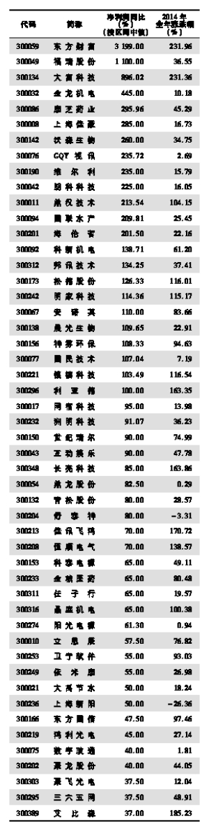 (专题数据由证券时报中心数据库提供。) 2014年已渐行渐远,创业板将进入年报密集披露期。据统计,截至昨日,已有152家创业板公司发布年度业绩预告,报喜公司占74%,主要集中在医药、计算机、电子等行业。净利润同比翻番的公司达23家。创业板预增王东方财富,预计净利润增长2999%~3399%。紧随其后的福瑞股份,预计净利润增长1000%~1200%。 本版导读: