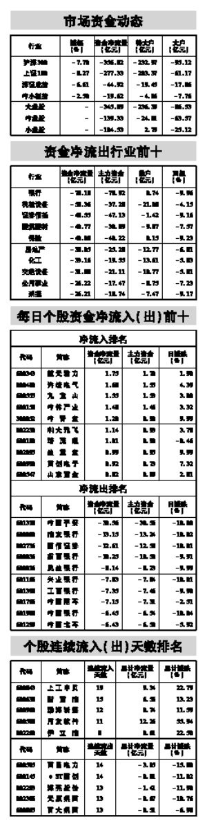 据STCN资金流向快报(http://data.stcn.com/statisticalData.shtml)数据显示,1月19日,沪深两市共流出资金589.75亿元,资金结束昨日的流入状态,转而流出。其中,沪市净流出402.24亿元,深市净流出187.51亿元。主力资金合计流出432.84亿元。 指数方面,上证180指数成份股合计资金流出277.33亿元,深证成指成份股资金流出44.92亿元,沪深300指数成份股资金 流出356.82亿元。以股本规模计,流通盘中大盘股资金流出345.89亿元,中盘股资金流出139.33亿元,小盘股资金流出104.53亿元。 行业方面,按照衍生申万一级行业分类计,今日有25个行业资金净流出。其中银行流出资金78.18亿,有较明显的资金出逃现象。 有色金属业已持续8个交易日净流出资金,共流出资金99.31亿,为今日行业连续流出天数榜第一。 上工申贝已持续19个交易日净流入资金,累计流入资金9.34亿,居今日个股连续流入天数榜首位。西昌电力已持续14个交易日净流出资金,累计流出资金3.05亿,为今日个股连续流出天数榜第一。 股指期货方面,今日IF1502合约收报3316.20点,下跌10.00%;成交106.33万手,持仓量增3182手,收报11.76万手;资金共流出0.02亿。(黄舒欣) 本版导读: