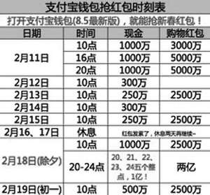 支付宝钱包放大招 春节发近6亿元红包 2015-02-10 来源:证券时报网 作者: