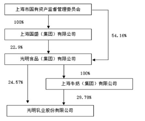 光明乳业股份有限公司 关于股东光明食品(集团)有限公司部分国有股权无偿划转的提示性公告 本公司董事会及全体董事保证本公告内容不存在任何虚假记载、误导性陈述或者重大遗漏,并对其内容的真实性、准确性和完整性承担个别及连带责任。 本公司于2015年2月16日收到股东光明食品(集团)有限公司(以下简称"光明食品集团")《关于光明食品(集团)有限公司部分国有股权无偿划转至上海国盛(集团)有限公司的通知》,根据上海国资国企改革的整体部署,为进一步优化资源配置,上海市国有资产监督管理委员会将其所持有的本公司股东光明食品集团54.16%股权无偿划转至上海国盛(集团)有限公司。本次划转完成后,本公司实际控制人未发生变化,仍为上海市国有资产监督管理委员会。 本次划转前后,本公司与股东、实际控制人之间的股权关系结构图如下: 划转前: ■ 划转后: ■ 本公司将持续关注本次无偿划转国有股权的进展情况,严格按照《公司法》、《证券法》等相关法律法规和规章的规定,及时履行信息披露义务。 特此公告。 光明乳业股份有限公司 二零一五年二月十六日 本版导读: