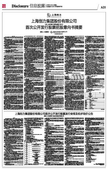 保荐人(主承销商):国金证券股份有限公司 特别提示 上海创力集团股份有限公司(以下简称“创力集团”或“发行人”)根据中国证券监督管理委员会(以下简称“证监会”)《证券发行与承销管理办法》(2014年修订)(以下简称“《管理办法》”)、《关于进一步推进新股发行体制改革的意见》(以下简称“《意见》”)、《首次公开发行股票时公司股东公开发售股份暂行规定》(2014年修订)等法规,及中国证券业协会(以下简称“协会”)《首次公开发行股票承销业务规范》(2014年修订)(以下简称“《业务规范》”)、《首次公开发行股票配售细则》(以下简称“《配售细则》”)和《首次公开发行股票网下投资者备案管理细则》(以下简称“《备案管理细则》”)等相关规定首次公开发行股票。本次初步询价和网下发行均通过上海证券交易所(以下简称“上交所”)网下申购电子化平台及中国证券登记结算有限责任公司上海分公司(以下简称“中国结算上海分公司”)登记结算平台进行。关于网下发行电子化的详细内容,请查阅上交所网站(www.sse.com.cn)公布的《上海市场首次公开发行股票网下发行实施办法》、《上海市场首次公开发行股票网上按市值申购实施办法》。 根据《意见》、《管理办法》、《业务规范》等规定的要求,本次发行在网下发行比例、回拨机制、定价程序、配售原则和方式、公司股东公开发售股份等方面有重大变化,请投资者重点关注。 重要提示 一、上海创力集团股份有限公司首次公开发行不超过7,960万股人民币普通股(A股)(以下简称“本次发行”)的申请已获证监会证监许可[2015]313号文核准。本次发行全部为公开发行新股,发行人原股东在本次发行中不公开发售股份。本次发行的主承销商为国金证券股份有限公司(以下简称“国金证券”或“保荐人(主承销商)”)。股票简称为“创力集团”,股票代码为603012,该代码同时适用于本次发行的初步询价及网下申购,本次发行网上申购代码为“732012”。 根据中国证监会《上市公司行业分类指引》(2012年修订),发行人所属行业为 “专用设备制造业”(C35)。中证指数有限公司已经发布了行业平均市盈率,请投资者决策时参考。 二、本次发行采用网下向符合条件的投资者询价配售(以下简称“网下发行”)和网上按市值申购方式向社会公众投资者定价发行(以下简称“网上发行”)相结合的方式进行。发行人和国金证券将通过网下初步询价直接确定发行价格,网下不再进行累计投标。初步询价及网下发行由国金证券通过上交所网下申购电子化平台组织实施,网上发行通过上交所交易系统(以下简称“交易系统”)进行。 上交所网下申购平台网址为:https://120.204.69.22/ipo。请符合资格的网下投资者通过上述网址参与本次发行的初步询价和网下申购。通过网下申购电子化平台报价、查询的时间为初步询价和网下申购期间每个交易日9:30至15:00。关于网下申购电子化平台的相关操作办法请查阅上交所网站(www.sse.com.cn)—快速导航—IPO业务专栏中的《上海市场首次公开发行股票网下发行实施办法》、《网下IPO系统用户手册(申购交易员分册)》等相关规定。 本公告所称“网下投资者”是指参与网下发行的个人投资者和机构投资者。 本公告所称“配售对象”是指参与网下发行的个人投资者账户、机构投资者账户或其管理的证券投资产品。 三、本次公开发行股票不超过7,960万股,全部为公开发行新股。本次发行前股东所持发行人股份在本次发行时不向投资者公开发售。本次发行网下初始发行数量为4,800万股,为本次发行总量的60.30%。网上发行量为本次发行总量减去网下发行量。发行后的总股本为不超过31,828万股。 四、国金证券作为本次发行的保荐人(主承销商)将于2015年3月11日(T-1日)组织本次网上路演。关于网上路演的具体信息请参阅2015年3月10日(T-2日)刊登的《上海创力集团股份有限公司首次公开发行股票网上路演公告》(以下简称“《网上路演公告》”)。 本次发行不安排网下公开路演推介。 五、本次网下初步询价时间为2015年3月6日(T-4日)和2015年3月9日(T-3日),每日9:30至15:00。符合条件的网下机构和个人投资者可以自主决定是否报价,并通过上交所网下申购电子化平台提交报价。 六、本次发行发行人和保荐人(主承销商)将通过向网下投资者询价的方式确定发行价格。定价方式、定价程序和有效报价投资者的确定详见本公告“六、定价和有效报价投资者的确定”。网下投资者的报价情况、发行价格和有效报价投资者名单等将在2015年3月11日(T-1日)刊登的《上海创力集团股份有限公司首次公开发行股票发行公告》(以下简称“《发行公告》”)中披露。 七、本次发行价格确定后,提供有效报价的投资者方可参与网下申购。本次网下申购的时间为2015年3月11日(T-1日)和2015年3月12日(T日)的每日9:30至15:00。在参与网下申购时,其申购价格为确定的发行价格,可申购数量应为初步询价中的有效报价对应的拟申购数量,配售对象应按照确定的发行价格与申购数量的乘积缴纳申购款,未及时足额缴纳申购款的,将被视为违约并应承担违约责任,保荐人(主承销商)会将违约情况报证监会和协会备案。 本次网下发行具体安排详见2015年3月11日(T-1日)刊登的《发行公告》。 八、符合相关法律法规,按时完成网下申购并及时足