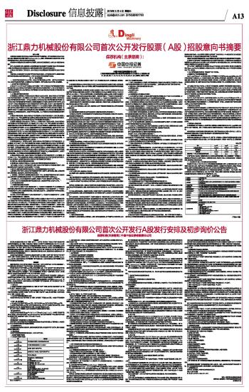 特别提示 浙江鼎力机械股份有限公司(以下简称“发行人”、“公司”或“浙江鼎力”)首次公开发行A股是在中国证券监督管理委员会(以下简称“中国证监会”)颁布的《证券发行与承销管理办法》(2014年3月21日修订)、《首次公开发行股票时公司股东公开发售股份暂行规定》(2014年3月21日修订)等有关法规,以及中国证券业协会(下称“协会”)制定的《首次公开发行股票承销业务规范》和《首次公开发行股票配售细则》等相关规定实施后的新股发行。本次发行在发行结构、发行方式、网下投资者认定、网下网上发行比例、定价及有效报价配售对象的确定、配售方式、回拨机制等方面有重大变化,敬请投资者认真阅读本公告,并重点关注本公告的重要提示部分。 本次发行初步询价和网下申购均采用上海证券交易所(以下简称“上交所”)网下发行电子化申购平台进行,请网下投资者认真阅读本公告。关于网下发行电子化的详细内容,请查阅上交所网站(www.sse.com.cn)公布的《上海市场首次公开发行股票网下发行实施办法》、《上海市场首次公开发行股票网上按市值申购实施办法》等相关规定。 重要提示 根据中国证监会《上市公司行业分类指引》(2012年修订),发行人所属行业为“C35专业设备制造业”。中证指数有限公司已经发布了行业平均市盈率,请投资者决策时参考。 浙江鼎力首次公开发行不超过1,625万股人民币普通股(A股)(下称“本次发行”)的申请已获得中国证监会证监许可[2015]314号文核准。本次发行的保荐机构(主承销商)为中国中投证券有限责任公司(以下简称“中国中投证券”或“主承销商”)。发行人的股票简称为“浙江鼎力”,股票代码为“603338”,该代码同时用于本次发行的初步询价及网下申购,网上申购代码为“732338”。 上交所网下申购平台网址为:https://120.204.69.22/ipo。请符合资格的网下投资者通过上述网址参与本次发行的初步询价和网下申购。通过申购平台报价、查询的时间为初步询价和网下申购期间每个交易日上午9:30至下午15:00。关于网下申购电子平台的相关操作办法请查阅上交所网站(www.sse.com.cn)—快速导航—IPO业务专栏中的《上海市场首次公开发行股票网下发行实施办法》、《网下IPO系统用户手册_申购交易员分册》等相关规定。 (一)发行方式 1、本次发行采用向网下投资者询价配售(以下简称“网下发行”)和网上按市值申购定价发行(以下简称“网上发行”)相结合的方式进行。 2、发行人和中国中投证券将通过网下初步询价确定发行价格,网下不再进行累计投标。网下发行由中国中投证券通过上交所网下申购电子化平台(以下简称“申购平台”)实施,网上发行通过上交所交易系统(以下简称“交易系统”)进行。 (二)公开发行新股数量和老股转让安排 本次发行向社会公众公开发行新股(以下简称“发行新股”)不超过1,625万股。本次发行不设老股转让。 (三)网下、网上发行数量 1、本次A股公开发行数量不超过1,625万股,占发行后总股本25%,发行后总股本不超过6,500万股。 2、本次发行数量不超过1,625万股,占发行后总股本的25%。其中,网下初始发行量为980万股,占本次发行数量的60.31%;网上初始发行数量为645万股,占本次发行数量的39.69%。 网上、网下申购后,再根据网上初步认购倍数进行回拨确定最终发行数量。 (四)初步询价时间 本次发行的初步询价期间为2015年3月9日(T-4日)至2015年3月10日(T-3日)。合格网下投资者可使用CA证书登录上交所申购平台网页(https://120.204.69.22/ipo)进行初步询价和网下申购。通过申购平台报价、查询的时间为上述期间每个交易日上午9:30至下午15:00。 (五)定价方式 采取通过向网下投资者询价的方式确定发行价格。 定价时发行人和主承销商将综合考虑剔除最高报价部分的初步询价数据、公司盈利能力、未来成长性、可比公司市盈率及募投项目资金需求等因素。 (六)有效报价的定义 有效报价是指投资者符合询价资格,按照询价规则进行报价,并且报价不低于发行价,同时未被最高报价部分剔除的报价。 (七)锁定期安排 本次发行的股票无流通限制及锁定安排,上市首日即可交易。 一、本次发行重要时间安排 (一)本次发行重要时间安排