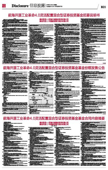 [重要提示] 1、前海开源工业革命4.0灵活配置混合型证券投资基金(以下简称“本基金”)的募集已获中国证监会2015年2月17日证监许可[2015]290号文注册。 2、前海开源工业革命4.0灵活配置混合型证券投资基金是契约型开放式证券投资基金。 3、本基金的管理人和注册登记机构为前海开源基金管理有限公司(以下简称“基金管理人”),基金托管人为中国建设银行股份有限公司。 4、本基金募集期自2015年3月9日至2015年3月25日,通过各销售机构的基金销售网点或按基金管理人、销售机构提供的其他方式公开发售。 5、本基金的发售对象为符合法律法规规定的可投资于证券投资基金的个人投资者、机构投资者、合格境外机构投资者和人民币合格境外机构投资者以及法律法规或中国证监会允许购买证券投资基金的其他投资人。 6、认购最低限额:在基金募集期内,投资人通过基金管理人的直销柜台、基金管理人的网上交易系统(目前仅对个人投资者开通)和代销机构首次认购的单笔最低限额为人民币1,000元(含认购费)。各销售机构对最低认购限额及交易级差有其他规定的,以各销售机构的业务规定为准。 7、本基金追加认购最低金额为人民币1,000元(含认购费),具体认购金额以各基金销售机构的公告为准。 8、投资人认购款项在募集期间产生的利息折合成基金份额记入投资人基金账户,具体份额以基金登记机构的登记为准。 9、投资人在募集期内可多次认购,认购一经受理不得撤销。销售网点对申请的受理并不表示对该申请的成功确认,申请的成功确认应以基金登记机构的登记确认为准。 10、本公告仅对本基金发售的有关事项和规定予以说明,投资者欲了解本基金的详细情况,请阅读刊登在《证券时报》、《证券日报》等报刊的《前海开源工业革命4.0灵活配置混合型证券投资基金招募说明书》;本基金的基金合同、招募说明书及本公告将同时发布在基金管理人的互联网网站(www.qhkyfund.com)。 11、募集期内,本基金还有可能新增或调整销售机构,敬请留意近期基金管理人及各代销机构的公告,或拨打基金管理人及各代销机构客户服务电话咨询。 12、投资人可拨打基金管理人客户服务电话(4001-666-998)或各代销机构咨询电话了解认购事宜。 13、基金管理人可综合各种情况对销售安排及募集期其他相关事项做适当调整。 14、风险提示:本基金投资于证券市场,基金净值会因为证券市场波动等因素产生波动,投资人在投资本基金前,应全面了解本基金的产品特性,充分考虑自身的风险承受能力,理性判断市场,并承担基金投资中出现的各类风险,包括但不限于:市场风险、信用风险、管理风险、流动性风险、操作和技术风险、合规性风险、股指期货投资风险、本基金特有的风险及其他风险等。 基金的过往业绩并不预示其未来表现,基金管理人管理的其他基金的业绩并不构成对本基金表现的保证。 基金管理人依照恪尽职守、诚实信用、谨慎勤勉的原则管理和运用基金财产,但不保证基金一定盈利,也不保证最低收益。基金管理人提醒投资人基金投资的“买者自负”原则,在投资人作出投资决策后,基金运营状况与基金净值变化引致的投资风险,由投资人自行承担。投资有风险,投资人在投资本基金前应认真阅读本基金的招募说明书和基金合同。 15、本公告解释权归基金管理人。 一、基金募集的基本情况 1、基金名称 前海开源工业革命4.0灵活配置混合型证券投资基金(基金简称:前海开源工业革命4.0混合;基金代码:001103) 2、基金类型 混合型证券投资基金 3、基金运作方式 契约型开放式 4、基金存续期限 不定期 5、基金份额初始面值 1.00元人民币 6、投资范围 本基金的投资范围为具有良好流动性的金融工具,包括国内依法发行上市的股票(包括中小板、创业板及其他经中国证监会核准上市的股票)、债券(包括国内依法发行和上市交易的国债、央行票据、金融债券、企业债券、公司债券、中期票据、短期融资券、超短期融资券、次级债券、政府支持机构债、政府支持债券、地方政府债、可转换债券及其他中国证监会允许投资的债券)、资产支持证券、债券回购、银行存款(包括协议存款、定期存款及其他银行存款)、货币市场工具、权证、股指期货以及法律法规或中国证监会允许基金投资的其他金融工具(但须符合中国证监会相关规定)。 如法律法规或监管机构以后允许基金投资其他品种,基金管理人在履行适当程序后,可以将其纳入投资范围。 基金的投资组合比例为:本基金股票投资占基金资产的比例为0-95%,投资于与工业革命4.0主题相关证券的比例不低于非现金基金资产的80%。本基金每个交易日日终在扣除股指期货合约需缴纳的交易保证金后,应当保持不低于基金资产净值5%的现金或者到期日在一年以内的政府债券。 如法律法规或中国证监会变更投资品种的投资比例限制,基金管理人在履行适当程序后,可以调整上述投资品种的投资比例。 本基金参与股指期货交易,应符合法律法规规定和基金合同约定的投资限制并遵守相关期货交易所的业务规则。 7、发售对象 本基金的发售对象为符合法律法规规定的可投资于证券投资基金的个人投资者、机构投资者、合格境外机构投资者和人民币合格境外机构投资者以及法律法规或中国证监会允许购买证券投资基金的其他投资人