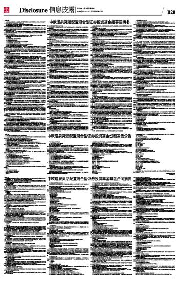 (上接B17版) ① 本公司开放式基金基金账号(若有)原件及复印件; ② 企业营业执照正本或副本原件及加盖单位公章的复印件;事业法人、社会团体或其他组织提供民政部门或主管部门颁发的注册登记证书原件及加盖单位公章的复印件; ③ 企业组织机构代码证、税务登记证正本或副本原件及加盖单位公章的复印件; ④ 基金业务授权委托书原件(加盖公章和法定代表人章/负责人章); ⑤ 提供法定代表人/负责人身份证件复印件(如为第二代身份证,应提供正反面复印件); ⑥ 业务经办人有效身份证明(身份证、军官证、士兵证、文职证、武警警官证,下同)原件及复印件(如为第二代身份证,应提供正反面复印件); ⑦ 加盖预留印鉴(公章、私章各一枚,并加盖公司公章)的《预留印鉴卡》一式两份; ⑧ 指定银行账户的《开户许可证》原件或指定银行出具的开户证明原件,提供复印件; ⑨填妥的《开放式基金账户业务申请表》一式两份,并加公章和法定代表人/负责人签章; 承诺函; 填妥的《投资人风险承受能力调查问卷(机构版)》。 注:上述指定银行账户是指投资人开户时预留并确认的作为赎回、分红、退款的唯一结算账户,原则上银行账户名称必须同投资人基金账户的户名一致。 4、办理认购须提交的材料: (1)个人投资者办理认购须提供以下材料(包括但不限于): ① 本人现时有效的身份证明原件及复印件; ② 加盖有效银行受理章的银行付款凭证回单联原件及复印件; ③ 填妥的《开放式基金交易业务申请表》一式两份,并经本人有效签名。 (2)机构投资者办理认购须提供以下材料(包括但不限于): ① 已填妥的《开放式基金交易业务申请表》一式两份,并加盖其在本公司的有效预留印鉴; ②加盖有效银行受理章的银行付款凭证回单联原件及复印件; ③ 经办人现时有效的身份证明原件及复印件。 5、缴款: 投资人需按照中欧基金管理公司直销中心的规定,在办理认购前将足额资金汇入中欧基金管理有限公司直销专户。 直销专户一: 户名:中欧基金管理有限公司 开户银行:建设银行上海市浦东分行 银行账号:31001520313050011627 直销专户二: 户名:中欧基金管理有限公司 开户银行:兴业银行上海分行营业部 银行账号:216200100100162028 投资人所填写的汇款单据在汇款用途中必须注明认购的基金名称或基金代码以及投资人姓名(如为个人投资者须注明身份证件号码),并确保在募集结束日16:30前到账。 若投资人认购资金在当日16:30之前未到本公司银行直销账户的,选择认购有效期延长的,则当日提交的申请顺延受理,受理日期(即有效申请日)以资金到账日为准;若由于银行原因,当日无法确认到账资金的投资人信息,则当日提交的申请顺延至投资人信息确认后受理。以上情况最迟延至募集结束日。直销中心可综合各种突发事件对上述安排作适当调整。 至募集期结束,以下情形将被认定为无效认购。造成无效认购的,中欧基金管理有限公司和直销专户的开户银行不承担任何责任: (1)投资人划来资金,但未办理开户手续或开户不成功的; (2)投资人划来资金,但未办理认购申请或认购申请未被确认的; (3)投资人划来的认购资金少于其申请的认购金额的; (4)投资人的认购资金在募集期结束日具体规定时点前仍未到账的; (5)其它导致认购无效的情况。 投资人认购无效或认购失败,认购款项将于本基金合同生效后三个工作日内划往投资人指定银行账户。如投资人未开户或开户不成功,其认购资金将退回其来款账户。 (四)其他销售机构的开户与认购程序以各销售机构的规定为准。 四、清算与交割 1、本基金募集期间募集的资金存入专门账户,在基金募集行为结束前,任何人不得动用。 2、若本基金的基金合同生效,则投资人交纳的有效认购款项在募集期间产生的利息将折算为基金份额归基金份额持有人所有,其中利息转份额以登记机构的记录为准。 3、登记机构根据相关法律法规以及业务规则和基金合同的约定,办理本基金的权益登记。 五、基金的验资与基金合同的生效 基金募集期限届满或基金管理人依据法律法规及招募说明书决定停止基金发售时,具备下列条件的,基金管理人应当按照规定办理验资和基金备案手续: 1、基金募集份额总额不少于2亿份,基金募集金额不少于2亿元人民币; 2、基金份额持有人的人数不少于200人。 符合上述基金合同生效条件的,基金管理人应当自募集期限届满或停止发售基金之日起十日内聘请法定验资机构验资,自收到验资报告之日起十日内,向中国证监会办理基金备案手续。自中国证监会书面确认之日起,基金备案手续办理完毕,基金合同生效。基金管理人应当在收到中国证监会确认文件的次日对基金合同生效事宜予以公告。 基金募集期限届满,但不符合基金合同生效条件的,基金管理人应当承担下列责任: 1、以其固有财产承担因募集行为而产生的债务和费用; 2、在基金募集期限届满后30日内返还投资人已缴纳的款项,并加计银行同期活期存款利息; 3、如基金募集失败,基金管理人、基金托管人及销售机构不得请求报酬。基金管理人、基金托管人和销售机构为基金募集支付之一切费用应由各方各自承担。 六、本次募集当事人或中介机构 (一)基金管理人 名称:中欧基金管理有限公司 成立日期:2006年7月19日 法定代表人:窦玉明 办公地址:上海市浦东新区花园石桥路