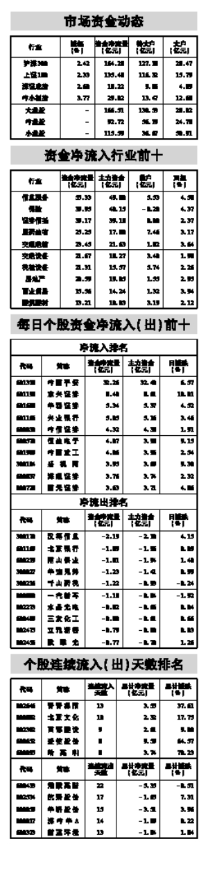 市场表现 Money Flow 随着年报披露高峰期到来,上市公司分红方案成为市场关注热点之一。截至昨日,两市已有386家公司公布分配预案(含已实施),其中350家公司现金分红,分红总额为350.34亿元,平均每家公司派现1亿元。从派现公司比例来看,在目前已公布年报的413家公司中,选择派现公司占比62.47%。值得关注的是,在目前派现公司中,若以2014年均价计算,并考虑去年中报派现,23家公司股息率超一年期定存利率(2.5%),其中,福耀玻璃以7.53%的股息率,独占鳌头。 (专题数据由证券时报中心数据库提供) 据STCN资金流向快报(http://data.stcn.com/statisticalData.shtml)数据显示,3月16日,沪深两市共流入资金374.83亿元,连续第2个交易日净流入。其中,沪市净流入229.54亿元,深市净流入145.29亿元。主力资金合计流入327.10亿元。 指数方面,上证180指数成份股合计资金流入135.48亿元,深证成指成份股资金流入18.22亿元,沪深300指数成份股资金流入164.28亿元。以股本规模计,流通盘中大盘股资金流入166.51亿元,中盘股资金流入92.72亿元,小盘股资金流入115.59亿元。 行业方面,按照衍生申万一级行业分类计,全市场回报最高的行业为信息服务,回报第二、三的行业为保险和商业贸易。 今日有25个行业资金净流入。其中,信息服务流入资金55.33亿,成为资金最关注的行业。 银行业已持续4个交易日净流入资金,共流入资金123.24亿,居今日行业连续流入天数榜首位。 青青稞酒已持续13个交易日净流入资金,累计流入资金3.55亿,居今日个股连续流入天数榜首位。冠豪高新已持续22个交易日净流出资金,累计流出资金5.35亿,为今日个股连续流出天数榜第一。 股指期货方面,今日期指合约均升。IF1503合约收报3713.80点,上涨2.72%;成交106.61万手,持仓量增990手,收报13.16万手;资金共流入0.02亿。(邱畅) 本版导读:
