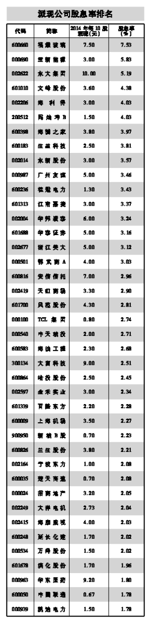 23家上市公司股息率超一年期定存 2015-03-17 来源:证券时报网 作者: