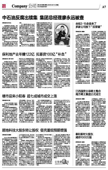 保利地产去年赚122亿 拟募资100亿“补血” 2015-03-17 来源:证券时报网 作者:水菁 马玲玲
