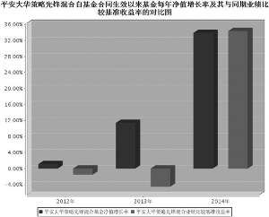基金管理人:平安大华基金管理有限公司 基金托管人:中国银行股份有限公司 送出日期:2015年3月26日 §1 重要提示 1.1 重要提示 基金管理人的董事会、董事保证本报告所载资料不存在虚假记载、误导性陈述或重大遗漏,并对其内容的真实性、准确性和完整性承担个别及连带的法律责任。本年度报告已经全部独立董事签字同意,并由董事长签发。 基金托管人中国银行股份有限公司根据本基金合同规定,于2015年3月18日复核了本报告中的财务指标、净值表现、利润分配情况、财务会计报告、投资组合报告等内容,保证复核内容不存在虚假记载、误导性陈述或者重大遗漏。 基金管理人承诺以诚实信用、勤勉尽责的原则管理和运用基金资产,但不保证基金一定盈利。 基金的过往业绩并不代表其未来表现。投资有风险,投资者在作出投资决策前应仔细阅读本基金的招募说明书及其更新。 本报告期自2014年1月1日起至12月31日止。 §2 基金简介 2.1 基金基本情况 ■ 2.2 基金产品说明 ■ 2.3 基金管理人和基金托管人 ■ 2.4信息披露方式 ■ §3 主要财务指标、基金净值表现及利润分配情况 3.1 主要会计数据和财务指标 金额单位:人民币元 ■ 注:1.本期已实现收益指基金本期利息收入、投资收益、其他收入(不含公允价值变动收益)扣除相关费用后的余额,本期利润为本期已实现收益加上本期公允价值变动收益; 2.期末可供分配利润采用期末资产负债表中未分配利润与未分配利润中已实现部分的孰低数(为期末余额,而非当期发生数); 3.上述基金业绩指标不包括持有人认购或交易基金的各项费用,计入费用后实际收益水平要低于所列数字。 3.2 基金净值表现 3.2.1 基金份额净值增长率及其与同期业绩比较基准收益率的比较 ■ 业绩比较基准:沪深300指数收益率×60%+中证全债指数收益率×40% 3.2.2 自基金合同生效以来基金份额累计净值增长率变动及其与同期业绩比较基准收益率变动的比较 ■ 1、本基金基金合同于2012年5月29日正式生效,截至报告期末已满两年; 2、按照本基金的基金合同规定,基金管理人应当自基金合同生效之日起六个月内使基金的投资组合比例符合基金合同的约定,截至报告期末本基金已完成建仓,建仓期结束时各项资产配置比例符合合同约定。 3.2.3 自基金合同生效以来基金每年净值增长率及其与同期业绩比较基准收益率的比较 ■ 3.3 过去三年基金的利润分配情况 单位:人民币元 ■ 1、遵照本基金基金合同的规定,本报告期内未进行利润分配。 §4 管理人报告 4.1 基金管理人及基金经理情况 4.1.1 基金管理人及其管理基金的经验 平安大华基金管理有限公司(以下简称"平安基金")经中国证监会证监许可【2010】1917号文批准设立。平安基金总部位于深圳,注册资本金为3亿元人民币,是目前中国内地基金业注册资本金最高的基金公司之一。目前公司股东为平安信托有限责任公司,持有股权60.7%;新加坡大华资产管理有限公司,持有股权25%;三亚盈湾旅业有限公司,持有股权14.3%。 平安基金秉承“规范、诚信、专业、创新”企业管理理念,致力于通过持续稳定的投资业绩,不断丰富的客户服务手段及服务内容,为投资人提供多样化的基金产品和高品质的理财服务,从而实现“以专业承载信赖”的品牌承诺,成为深得投资人信赖的基金管理公司。截至2014年12月31日,平安基金共管理七只开放式基金,资产管理总规模超125亿元。 4.1.2 基金经理(或基金经理小组)及基金经理助理简介 ■ 4.2 管理人对报告期内本基金运作遵规守信情况的说明 本报告期内,本基金管理人严格遵守《中华人民共和国证券投资基金法》、《公开募集证券投资基金运作管理办法》、《证券投资基金销售管理办法》和《证券投资基金信息披露管理办法》等有关法律法规及各项实施准则、《平安大华策略先锋混合型证券投资基金基金合同》和其他有关法律法规的规定,本着诚实信用、勤勉尽责的原则管理和运用基金资产,在严格控制风险的基础上,为基金份额持有人谋求最大利益。本报告期内,基金运作整体合法合规,没有损害基金份额持有人利益。基金的投资范围、投资比例及投资组合符合有关法律法规及基金合同的规定。 4.3 管理人对报告期内公平交易情况的专项说明 4.3.1 公平交易制度和控制方法 本报告期内,根据《证券投资基金管理公司公平交易制度指导意见》,本基金管理人制定并下发了《平安大华基金管理有限责任公司公平交易管理制度》、《平安大华基金管理有限责任公司异常交易监控及报告制度》,严格执行法律法规及制度要求,从以下五个方面对交易行为进行严格控制:一是搭建平等的投资信息平台,合理设置各类资产管理业务之间以及各类资产管理业务内部的组织结构,在保证各投资组合投资决策相对独立性的同时,确保其在获得投资信息、投资建议和实施投资决策等方面享有公平的机会。二是制定公平交易规则,建立科学的投资决策体系,加强交易执行环节的内部控制,并通过工作制度、流程和技术手段保证公平交易原则的实现。三是加强对投资交易行为的监察稽核力度,建立有效的异常交易行为日常监控和分析评估制度,通过对投资交易行为的监控、分析评估和信息披露来加强对公平交易过程和结果的监督。四是明确报告制度和路线,根据法规及公司内部要求,分别于每季度和每