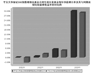 基金管理人:平安大华基金管理有限公司 基金托管人:中国银行股份有限公司 送出日期:2015年3月26日 §1 重要提示 1.1 重要提示 基金管理人的董事会、董事保证本报告所载资料不存在虚假记载、误导性陈述或重大遗漏,并对其内容的真实性、准确性和完整性承担个别及连带的法律责任。本年度报告已经全部独立董事签字同意,并由董事长签发。 基金托管人中国银行股份有限公司根据本基金合同规定,于2015年3月18日复核了本报告中的财务指标、净值表现、利润分配情况、财务会计报告、投资组合报告等内容,保证复核内容不存在虚假记载、误导性陈述或者重大遗漏。 基金管理人承诺以诚实信用、勤勉尽责的原则管理和运用基金资产,但不保证基金一定盈利。 基金的过往业绩并不代表其未来表现。投资有风险,投资者在作出投资决策前应仔细阅读本基金的招募说明书及其更新。 本报告期自2014年1月1日起至12月31日止。 §2 基金简介 2.1 基金基本情况 ■ 2.2 基金产品说明 ■ 2.3 基金管理人和基金托管人 ■ 2.4信息披露方式 ■ §3 主要财务指标、基金净值表现及利润分配情况 3.1 主要会计数据和财务指标 金额单位:人民币元 ■ 注:1、本期已实现收益指基金本期利息收入、投资收益、其他收入(不含公允价值变动收益)扣除相关费用后的余额,本期利润为本期已实现收益加上本期公允价值变动收益; 2、期末可供分配利润是采用期末资产负债表未分配利润与未分配利润中已实现部分的孰低数; 3、上述基金业绩指标不包括持有人认购或交易基金的各项费用,计入费用后实际收益水平要低于所列数字。 3.2 基金净值表现 3.2.1 基金份额净值增长率及其与同期业绩比较基准收益率的比较 ■ 注:业绩比较基准:深证300指数收益率×95%+商业银行活期存款利率(税后)×5% 3.2.2 自基金合同生效以来基金份额累计净值增长率变动及其与同期业绩比较基准收益率变动的比较 ■ 1、本基金基金合同于2011年12月20日正式生效,截至报告期末已满三年; 2、按照本基金的基金合同规定,基金管理人应当自基金合同生效之日起六个月内使基金的投资组合比例符合基金合同的约定,截至报告期末本基金已完成建仓。 3.2.3 自基金合同生效以来基金每年净值增长率及其与同期业绩比较基准收益率的比较 ■ 3.3 过去三年基金的利润分配情况 单位:人民币元 ■ §4 管理人报告 4.1 基金管理人及基金经理情况 4.1.1 基金管理人及其管理基金的经验 平安大华基金管理有限公司(以下简称"平安基金")经中国证监会证监许可【2010】1917号文批准设立。平安基金总部位于深圳,注册资本金为3亿元人民币,是目前中国内地基金业注册资本金最高的基金公司之一。目前公司股东为平安信托有限责任公司,持有股权60.7%;新加坡大华资产管理有限公司,持有股权25%;三亚盈湾旅业有限公司,持有股权14.3%。 平安基金秉承“规范、诚信、专业、创新”企业管理理念,致力于通过持续稳定的投资业绩,不断丰富的客户服务手段及服务内容,为投资人提供多样化的基金产品和高品质的理财服务,从而实现“以专业承载信赖”的品牌承诺,成为深得投资人信赖的基金管理公司。截至2014年12月31日,平安基金共管理七只开放式基金,资产管理总规模超125亿元。 4.1.2 基金经理(或基金经理小组)及基金经理助理简介 ■ 4.2 管理人对报告期内本基金运作遵规守信情况的说明 本报告期内,本基金管理人严格遵守《中华人民共和国证券投资基金法》、《公开募集证券投资基金运作管理办法》、《证券投资基金销售管理办法》和《证券投资基金信息披露管理办法》等有关法律法规及各项实施准则、《平安大华深证300指数增强型证券投资基金基金合同》和其他有关法律法规的规定,本着诚实信用、勤勉尽责的原则管理和运用基金资产,在严格控制风险的基础上,为基金份额持有人谋求最大利益。本报告期内,基金运作整体合法合规,没有损害基金份额持有人利益。基金的投资范围、投资比例及投资组合符合有关法律法规及基金合同的规定。 4.3 管理人对报告期内公平交易情况的专项说明 4.3.1 公平交易制度和控制方法 本报告期内,根据《证券投资基金管理公司公平交易制度指导意见》,本基金管理人制定并下发了《平安大华基金管理有限责任公司公平交易管理制度》、《平安大华基金管理有限责任公司异常交易监控及报告制度》,严格执行法律法规及制度要求,从以下五个方面对交易行为进行严格控制:一是搭建平等的投资信息平台,合理设置各类资产管理业务之间以及各类资产管理业务内部的组织结构,在保证各投资组合投资决策相对独立性的同时,确保其在获得投资信息、投资建议和实施投资决策等方面享有公平的机会。二是制定公平交易规则,建立科学的投资决策体系,加强交易执行环节的内部控制,并通过工作制度、流程和技术手段保证公平交易原则的实现。三是加强对投资交易行为的监察稽核力度,建立有效的异常交易行为日常监控和分析评估制度,通过对投资交易行为的监控、分析评估和信息披露来加强对公平交易过程和结果的监督。四是明确报告制度和路线,根据法规及公司内部要求,分别于每季度和每年度对公司管理的不同投资组合的投资业绩进行分析、评估,形成分析报告,由投资组合经理、督察长、总经理签署后,妥