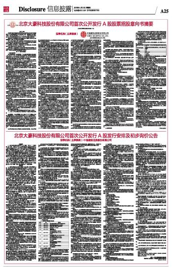 特别提示 1、北京大豪科技股份有限公司(以下简称“发行人”、“大豪科技”或“公司”)根据《关于进一步推进新股发行体制改革的意见》(证监会公告[2013]42号)、《关于修改〈证券发行与承销管理办法〉的决定》(中国证监会令第98号)、《关于修改〈首次公开发行股票时公司股东公开发售股份暂行规定〉的决定》(证监会公告[2014]11号)、以及《首次公开发行股票承销业务规范》、《首次公开发行股票配售细则》、《首次公开发行股票网下投资者备案管理细则》(中证协发[2014]77号)的相关规定,首次公开发行A股并拟在上海证券交易所上市。本次发行在网下投资者条件、网上网下初始发行比例、回拨机制、初步询价方式、定价及配售方式等方面有重大变化,敬请投资者重点关注。 2、北京大豪科技股份有限公司首次公开发行A股初步询价和网下发行均采用上海证券交易所(以下简称“上交所”)网下申购电子化平台(以下简称“申购平台”)进行,请网下投资者认真阅读本公告。关于网下发行电子化的详细内容,请查阅上交所网站(www.sse.com.cn)公布的《上海市场首次公开发行股票网下发行实施办法》(上证发[2014]30号,以下简称“《网下发行实施办法》”)等相关规定。 重要提示 1、大豪科技首次公开发行不超过5,100万股人民币普通股(A股)的申请已获中国证券监督管理委员会证监许可[2015]542号文核准,按照中国证监会《上市公司行业分类指引》(2012年修订),公司所处行业为计算机、通信和其他电子设备制造业(C39)中的其他计算机制造(C3919)。本次发行的保荐机构(主承销商)为中信建投证券股份有限公司(以下简称“保荐机构(主承销商)”或“主承销商”)。发行人的股票简称为“大豪科技”,股票代码为“603025”,该代码同时用于本次发行的初步询价及网下申购;网上申购代码为“732025”。 2、本次发行采用网下向符合条件的投资者询价配售(以下简称“网下发行”)和网上按市值申购方式向社会公众投资者定价发行(以下简称“网上发行”)相结合的方式进行。发行人和中信建投将通过网下初步询价直接确定发行价格,网下不再进行累计投标。初步询价及网下发行由中信建投通过上海证券交易所(以下简称“上交所”)网下申购电子化平台(以下简称“申购平台”)组织实施,网上发行通过上交所交易系统(以下简称“交易系统”)进行。 上交所网下申购平台网址为:https://120.204.69.22/ipo。请符合资格的网下投资者通过上述网址参与本次发行的初步询价和网下申购。通过申购平台报价、查询的时间为初步询价和网下申购期间每个交易日9:30 至15:00。关于网下申购电子平台的相关操作办法请查阅上交所网站(www.sse.com.cn)—快速导航—IPO 业务专栏中的《上海市场首次公开发行股票网下发行实施办法》、《网下IPO系统用户手册(申购交易员分册)》等相关规定。 本次公开发行A股数量不超过5,100万股,占发行后总股本的比例为11.41%。网下初始发行数量为3,570万股,占本次发行总量的70%;网上初始发行数量为1,530万股,占本次发行总量的30%。T-3日初步询价结束后,发行人和主承销商将根据询价结果协商确定最终发行规模,并按上述比例调整网上、网下初始发行量。 3、本次发行仅为发行人公开发行新股(以下简称“发行新股”),发行人股东不公开发售其所持股份(以下简称“老股转让”)。 4、本公告所称“网下投资者”是指参与网下发行的个人投资者和机构投资者。本公告所称“配售对象”是指参与网下发行的投资者或其管理的证券投资产品。网下投资者应当于2015年4月7日(T-5日)的12:00前在中国证券业协会完成配售对象信息的登记备案工作,且已开通上交所网下发行电子平台CA证书。 主承销商已根据《证券发行与承销管理办法》、《首次公开发行股票承销业务规范》等相关制度的要求,制定了网下投资者的标准。具体标准及安排请见本公告“二、初步询价安排 (一)参与初步询价的投资者条件”。 若配售对象为私募投资基金,或除公募基金、社保基金、企业年金基金、保险资金之外的配售对象的任一级出资方存在私募投资基金,该等私募投资基金均须按照《证券投资基金法》、《私募投资基金监督管理暂行办法》、《私募投资基金管理人登记和基金备案办法(试行)》的规定,在2015年4月7日(T-5日)17:00前完成在中国证券投资基金业协会的备案。 只有符合主承销商及发行人确定的网下投资者标准要求的投资者方能参与本次发行初步询价。不符合相关标准而参与本次发行初步询价的,须自行承担一切由该行为引发的后果,主承销商将在上交所网下发行电子平台中将其报价设定为无效,并在《发行公告》中予以披露。 提请投资者注意,主承销商将在初步询价及配售前对网下投资者是否存在禁止性情形进行核查,并要求网下投资者提供符合资质要求的承诺和证明材料。如网下投资者拒绝配合核查或其提供的材料不足以排除其存在禁止性情形的,或经核查不符合配售资格的,主承销商将拒绝其参与初步询价及配售。 本次发行网下最低申购量为360万股,请投资者结合自身拟申报价格情况确定有足够资金参与网下申购。 5、参与本次发行初步询价的投资者应满足《首次公开发行股票承销业务规范》、《首次公开发行股票配售细则》、《首次公开发行股票网下投资者备案管理细则》(中