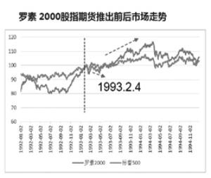 中证500指数长期优于沪深300指数的表现也体现了市场对成长性的认可。我们也有过这样一个有趣的观察:中证500指数的成分股“长大”后,满足总市值排序及成交金额相应标准后, 有机会进入沪深300指数,而对于这些长大了的成分股,他们的市场表现相对较弱。从2008年至今进行统计,这些成分股前半年的平均涨幅为11.3%,而进入沪深300指数后的半年涨幅仅为-2.9%,两者幅度相差达14%;同时,约62%此类股票之后的表现弱于前期表现。 问题二:2010年沪深300股指期货推出后,沪深300指数无论短期还是长期都经历了调整, 是不是此次500期货推出也会对中小盘股票有较大的调整? 从海内外历史数据来看,期货上市前,多数指数的表现较好;上市后的表现各有不同。的确,在A股沪深300股指期货2010年上市之后,3个月内沪深300指数下跌25%,之后在4年多时间内表现较弱,有较明显的下行趋势。而从美股市场来看,如下图所示,当初标普500期货在1982年上市后,短期几个月有个承压的形态;而之后不改向上趋势;而美股跟踪中小盘指数罗素 2000 的期货于1993年上市之后,短期向下调整幅度更小,最大跌幅也就5%左右,随后一路上扬。
