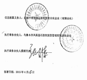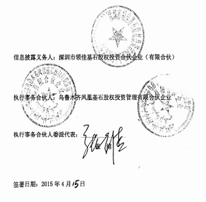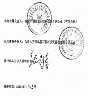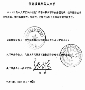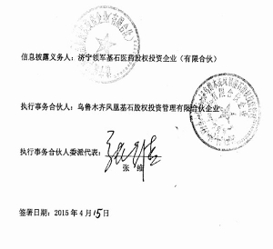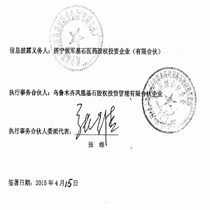浙江康恩贝制药股份有限公司 简式权益变动报告书 上市公司名称:浙江康恩贝制药股份有限公司 股票上市地点:上海证券交易所 股票简称:康恩贝 股票代码:6000572 通讯地址:浙江省杭州市高新技术开发区滨江科技经济园滨康路568号 信息披露义务人 名称:济宁领军基石医药股权投资企业(有限合伙) 住所:济宁市高新区327国道南火炬工业园内 通讯地址:深圳市福田中心区福华三中路诺德金融中心35F 名称:盐城市领佳基石股权投资合伙企业(有限合伙) 住所:盐城经济技术开发区希望大道南路5号 通讯地址:深圳市福田中心区福华三中路诺德金融中心35F 名称:深圳市领佳基石股权投资合伙企业(有限合伙) 住所:深圳市福田中心区福华三中路诺德金融中心35F 通讯地址:深圳市福田中心区福华三中路诺德金融中心35F 股份变动性质:取得上市公司发行新股(普通股) 报告书签署日期:2015年4月15日 信息披露义务人声明 一、本报告书系信息披露义务人依据《中华人民共和国证券法》、《上市公司收购管理办法》、《公开发行证券的公司信息披露内容与格式准则第15号—权益变动报告书》等相关法律、法规及规范性文件编制。 二、信息披露义务人签署本报告书已获得必要的授权和批准,其履行亦不违反信息披露义务人的《公司章程》或内部规则中的任何条款,或与之相冲突。 三、依据《中华人民共和国证券法》、《上市公司收购管理办法》的规定,本报告书已全面披露信息披露义务人于浙江康恩贝制药股份有限公司拥有权益的股份。截至本报告书签署日,除本报告书披露的持股信息外,信息披露义务人没有通过任何其他方式增加或减少在浙江康恩贝制药股份有限公司拥有权益的股份。 四、本次权益变动是根据本报告所载明的资料进行的。除本信息披露义务人外,没有委托或者授权任何其他人提供未在本报告书中列载的信息和对本报告书做出任何解释或者说明。 五、信息披露义务人及其主要负责人保证本报告书及相关申报文件内容的真实性、准确性、完整性,承诺其中不存在虚假记载、误导性陈述或重大遗漏,并就其保证承担个别和连带的法律责任。 六、本次权益变动中,济宁领军基石医药股权投资企业(有限合伙)、盐城市领佳基石股权投资合伙企业(有限合伙)、深圳市领佳基石股权投资合伙企业(有限合伙)以共同名义负责统一编制和报送本简式权益变动报告书,并在本简式权益变动报告书上签字盖章。 第一节 释义 在本报告书中,除非文义载明,下列简称具有如下含义: ■ 第二节 信息披露义务人介绍 一、信息披露义务人的基本情况 信息披露义务人:济宁领军基石医药股权投资企业(有限合伙) ■ 信息披露义务人:盐城市领佳基石股权投资合伙企业(有限合伙) ■ ■ 信息披露义务人:深圳市领佳基石股权投资合伙企业(有限合伙) ■ 上述信息披露义务人的普通合伙人、执行事务合伙人均为乌鲁木齐凤凰基石股权投资管理有限合伙企业,实际控制人均为张维,构成一致行动人。 截至本报告书签署日,各信息披露义务人的控制关系图如下: ■ 说明:各信息披露义务人的有限合伙人具体情况见以上信息披露义务人基本情况介绍表 二、信息披露义务人的董事及主要负责人的基本情况 信息披露义务人均未设置董事,负责人均为张维,张维的基本情况如下: ■ 三、信息披露义务人持有、控制境内外其他上市公司5%以上发行在外股份的情况 截至本报告书签署之日,除康恩贝外,信息披露义务人未持有、控制其他境内、境外上市公司5%以上发行在外的股份。 第三节 持股目的 一、本次认购目的 信息披露义务人认购康恩贝向其发行的股份,对康恩贝进行战略投资。 二、信息披露义务人是否拟在未来12个月内继续增持康恩贝股份 本次信息披露义务人认购康恩贝非公开发行股份后,尚无在未来12个月内增持康恩贝权益的计划。 第四节 权益变动方式 一、权益变动方式 信息披露义务人认购康恩贝向其发行的股份,对康恩贝进行战略投资。 二、认购新股的种类、数量和比例、发行价格和定价依据、支付条件和支付方式 1、认购新股的种类 信息披露义务人本次认购康恩贝发行的新股均为普通股。 2、认购新股的数量和比例 本次发行的发行数量为17,500万股。其中,济宁领军基石医药股权投资企业(有限合伙)认购本次发行股份2,083万股;盐城市领佳基石股权投资合伙企业(有限合伙)认购本次发行股份1,667万股;深圳市领佳基石股权投资合伙企业(有限合伙)认购本次发行股份1,250万股。本次信息披露义务人合计认购本次发行股份5,000万股,占发行完成后康恩贝已发行股票数量的5.08%。 3、发行价格和定价依据 本次非公开发行的定价基准日为本次非公开发行股票的董事会决议公告日(2014年4月8日),发行价格确定为12元/股,不低于定价基准日前20个交易日公司股票均价的90%(定价基准日前20个交易日股票交易均价=定价基准日前20个交易日股票交易总额/定价基准日前20个交易日股票交易总量),即11.97元/股。 若发行人股票在定价基准日至发行日期间发生派息、送红股、资本公积金转增股本等除权除息事项,本次非公开发行价格将按以下办法作相应调整: 假设调整前发行价格为P0,每股送股或转增股本数为N,每股派息/现金分红为D,调整后发行价格为P1,则: 派息/现金分红:P1 = P0 - D 送股或转增股本:P1 =