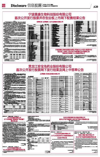 黑龙江珍宝岛药业股份有限公司 首次公开发行股票网下发行结果及网上中签率公告 重要提示 1、黑龙江珍宝岛药业股份有限公司(以下简称“发行人”、“珍宝岛”)首次公开发行不超过6,458万股人民币普通股A股(以下简称“本次发行”)的申请已获中国证券监督管理委员会证监许可[2015]547号文核准。本次发行的主承销商为招商证券股份有限公司(以下简称“招商证券”或“主承销商”)。发行人的股票简称为“珍宝岛”,股票代码为“603567”。 2、本次发行采用网下向符合条件的投资者询价配售(以下简称“网下发行”)和网上按市值申购方式向社会公众投资者定价发行(以下简称“网上发行”)相结合的方式进行。本次股票发行价格为23.60元/股,发行数量为6,458万股。回拨机制启动前,网下初始发行数量为4,600万股,占本次发行总量的71.23%;网上初始发行数量为1,858万股,占本次发行总量的28.77%。 3、本次发行的网上、网下申购缴款工作已于2015年4月14日(T日)结束。在初步询价阶段提交有效报价的49个网下投资者管理的74个配售对象全部参与了网下申购并按照2015年4月13日(T-1日)公布的《黑龙江珍宝岛药业股份有限公司首次公开发行股票发行公告》(以下简称“《发行公告》”)的要求及时足额缴纳了申购款,缴付申购资金已经安永华明会计师事务所(特殊普通合伙)审验,并出具了验资报告;网下发行过程已经广东华商律师事务所见证,并出具了专项法律意见书。 4、根据网上申购情况,网上初步有效申购倍数为377.65倍,根据《发行公告》规定的回拨安排,发行人和主承销商将本次发行股份的3,954.20万股股票(约占本次发行总量的61.2294%)由网下回拨至网上。回拨后,网下最终发行数量为645.80万股,占本次发行总量的10%;网上最终发行数量为5,812.20万股,占本次发行总量90%。 5、本公告披露了本次网下发行的配售结果,包括获配投资者名称、获配投资者的申购数量、获配数量等。根据2015年4月13日(T-1日)公布的《发行公告》,本公告一经刊出即视同向参与网下申购获得配售的配售对象送达获配通知。 一、网下申购及缴款情况 根据《证券发行与承销管理办法》(中国证监会令第98号)的要求,主承销商对参与网下申购的投资者资格进行了核查和确认。依据上海证券交易所网下发行电子平台最终收到的资金有效申购结果,主承销商做出如下统计: 经核查确认,49家网下投资者管理的74个有效报价配售对象全部按照《发行公告》的要求进行了申购,并及时、足额缴纳了申购款,有效申购资金为80,334,400,000元,有效申购数量为3,404,000,000股。 二、网上申购情况及网上发行初步中签率 根据上海证券交易所提供的数据,本次网上发行有效申购户数为822,072户。有效申购股数为7,016,745,000股。经安永华明会计师事务所(特殊普通合伙)审验,网上冻结资金量为165,595,182,000元,网上发行初步中签率为0.26479514%,认购倍数为377.65倍。配号总数为7,016,745个,号码范围为10,000,001 - 17,016,745。 三、回拨机制实施、发行结构及网上发行最终中签率 本次股票发行数量为6,458万股。回拨机制启动前,网下初始发行数量为4,600万股,占本次发行总量的71.23%;网上初始发行数量为1,858万股,占本次发行总量的28.77%。 根据《发行公告》公布的回拨机制和网上资金申购情况,由于网上初步有效申购倍数为377.65倍,超过150倍,发行人和主承销商决定启动回拨机制,将3,954.20万股股票(本次发行总量的61.2294%)从网下回拨到网上。回拨后,网下最终发行数量为645.8万股,占本次发行总量的10%;网上最终发行数量为5,812.2万股,占本次发行总量90%。 回拨机制启动后,网上发行最终中签率为0.82833280%。 四、网下配售结果 本次网下发行有效申购数量为340,400万股,其中公募基金和社保基金(A类投资者)有效申购数量为110,400万股,约占本次网下发行有效申购数量的32.43%;年金保险资金(B类投资者)有效申购数量为105,800万股,约占本次网下发行有效申购数量的31.08%,其他投资者(C类投资者)有效申购数量为124,200万股,约占本次网下发行有效申购数量的36.49%。 根据《黑龙江珍宝岛药业股份有限公司首次公开发行股票发行安排及初步询价公告》(以下简称“《初步询价公告》”)规定的网下配售原则,各类投资者的获配信息如下: | 配售对象类型 | 获配比例 | 获配数量(股) | 占网下最终发行数量的比例 | | A类投资者 | 0.23423914% | 2,586,000 | 40.043357% | | B类投资者 | 0.19565218% | 2,070,000 | 32.053267% | | C类投资者 | 0.14508857% | 1,802,000 | 27.903376% | | 合计 | | 6,458,000 | 100.00% |