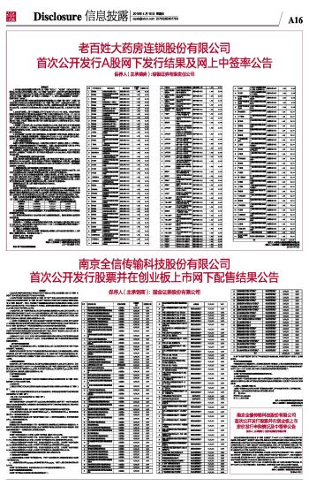 老百姓大药房连锁股份有限公司首次公开发行A股网下发行结果及网上中签率公告
