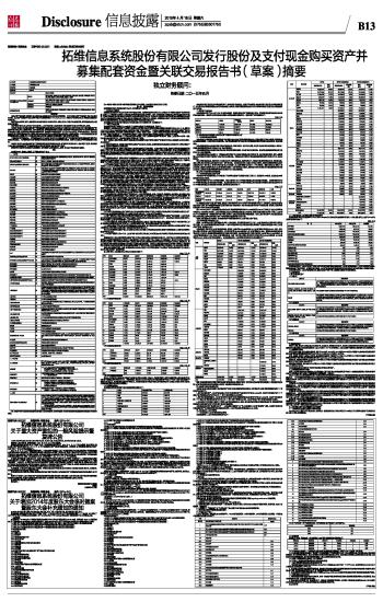 股票代码:002261 股票简称:拓维信息 编号:2015-041 拓维信息系统股份有限公司 关于重大资产重组的一般风险提示暨 复牌公告 本公司及董事会全体成员保证公告内容的真实、准确和完整,没有虚假记载、误导性陈述或重大遗漏。 特别提示:经公司申请,公司股票将于 2015 年 04 月 20 日开市起复牌。 拓维信息系统股份有限公司(以下简称“公司”)股票因筹划重大事项于 2015 年 01 月 12 日开市起停牌,经公司研究,确认为重大资产重组事项后自2015 年 01 月 20 日开市起按重大资产重组事项继续停牌。停牌期间,公司根据相关规定至少每5个交易日发布一次有关事项的进展公告。 2015 年 04 月 17 日,公司第五届董事会第二十五次会议审议通过了《关于本次发行股份及支付现金购买资产并募集配套资金暨关联交易的方案的议案》、《拓维信息系统股份有限公司2015年度员工持股计划(草案)(非公开发行方式认购)》等与本次发行股份及支付现金购买资产事项相关的议案,公司披露《拓维信息系统股份有限公司发行股份及支付现金购买资产并募集配套资金暨关联交易报告书(草案)》及其他相关文件后,公司股票将于 2015 年 04 月 20 日开市起复牌。 公司拟以发行股份及支付现金的方式,购买山东长征教育科技股份有限公司(以下简称“长征教育”) 和深圳市海云天科技股份有限公司(以下简称“海云天”)100%股份、珠海市龙星信息技术有限公司49%股权、陕西诚长信息咨询有限公司(以下简称“陕西诚长”)40%股权。公司发行股份及支付现金收购资产的同时,将进行配套融资,向李新宇、宋鹰、张忠革、拓维信息2015年度员工持股计划、深圳市天富信合投资合伙企业(有限合伙)、华泰紫金定增3号集合资产管理计划、袁浩卿、姚劲波等8名特定投资者非公开发行股票募集配套资金,募集配套资金金额不超过本次交易总金额的25%。 本次交易前,公司已持有龙星信息51%的股权,并通过龙星信息持有诚长信息60%的股权;本次交易完成后,海云天、长征教育、龙星信息和诚长信息均成为公司全资子公司。 本次交易的具体方案详见《拓维信息系统股份有限公司发行股份及支付现金购买资产并募集配套资金暨关联交易报告书(草案)》。 根据《关于加强与上市公司重大资产重组相关股票异常交易监管的通知》相关规定,如公司本次重大资产重组事项停牌前股票交易存在明显异常,可能存在涉嫌内幕交易被监管部门立案调查,导致本次交易事项被暂停、被终止的风险。 公司郑重提示投资者注意投资风险。 特此公告。 拓维信息系统股份有限公司 董事会 2015年04月17日