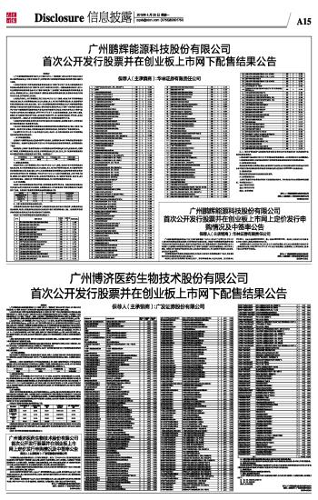 重要提示 1、广州博济医药生物技术股份有限公司(以下简称“发行人”、“博济医药”)首次公开发行不超过1,667万股人民币普通股A股(以下简称“本次发行”)的申请已获中国证券监督管理委员会证监许可[2015]539文核准。 2、本次发行采用网下向符合条件的投资者询价配售(以下简称“网下发行”)和网上按市值申购方式向社会公众投资者定价发行(以下简称“网上发行”)相结合的方式进行。在剔除最高部分报价后,发行人和保荐人(主承销商)广发证券股份有限公司(以下简称“广发证券”、“保荐人(主承销商)”)考虑剩余报价和拟申购数量、所处行业、市场情况、同行业上市公司估值水平、募集资金需求及承销风险等因素,协商确定本次发行价格为12.87元/股,发行数量为1,667万股。 3、本次发行的网上、网下申购缴款工作已于2015年4月16日(T日)结束,本次发行网下有效申购数量为218,160万股,网上有效申购数量为499,361.65万股,网上、网下发行均获得足额认购,网上投资者初步有效认购倍数为760.06倍,超过150倍。发行人和保荐人(主承销商)根据总体申购情况以及《广州博济医药生物技术股份有限公司首次公开发行股票并在创业板上市初步询价及推介公告》(以下简称“《初步询价及推介公告》”)和《广州博济医药生物技术股份有限公司首次公开发行股票并在创业板上市发行公告》(以下简称“《发行公告》”)公布的网上网下回拨机制,于2015年4月17日(T+1日)决定启动回拨机制,从网下向网上回拨,回拨后,网下最终发行数量为166.7万股,占本次发行数量的10%,网上最终发行数量为1,500.3万股,占本次发行数量的90%。回拨后,网下有效申购倍数为1,309倍;网上有效申购倍数为332.84倍。 4、根据《初步询价及推介公告》和《发行公告》中规定的网下配售原则,保荐人(主承销商)及发行人对所有参加网下申购并缴款的网下投资者进行配售。 5、参与网下申购的投资者缴付的申购资金已经立信会计师事务所(特殊普通合伙)审验,并出具了验资报告。本次网下发行过程由广东华商律师事务所见证,并对此出具了专项法律意见书。 6、根据2015年4月15日(T-1日)公布的《发行公告》,本公告一经刊出即视同向参与网下申购获得配售的所有投资者送达获配通知。 一、网下申购及缴款情况 根据《证券发行与承销管理办法》(证监会令第98号)的要求,保荐人(主承销商)对参与网下申购的投资者资格进行了核查和确认。依据深圳证券交易所网下发行电子平台最终收到的资金有效申购结果,保荐人(主承销商)做出如下统计: 经核查确认,114家网下投资者管理的217个有效报价配售对象中,有113家网下投资者管理的216个有效报价配售对象按照《发行公告》的要求参与网下申购并及时、足额缴纳了申购款,有效申购数量为218,160万股,网下发行申购冻结资金为2,807,719.2万元;有1个配售对象既未参与网下申购也未缴纳申购款。具体情况如下: | 网下投资者名称 | 配售对象账户名称 | 可申购数量(万股) | 申购无效原因 | | 曲爱娟 | 曲爱娟 | 1,010 | 未申购未缴款 |