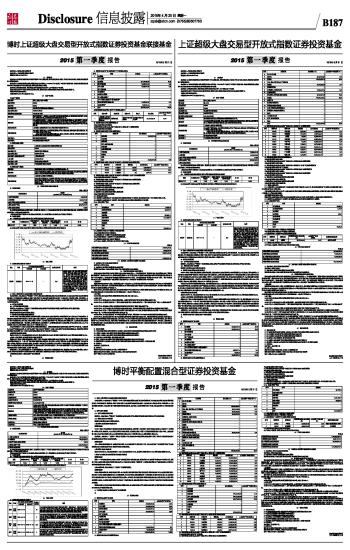 基金管理人:博时基金管理有限公司 基金托管人:中国建设银行股份有限公司 报告送出日期:2015年4月20日 §1 重要提示 基金管理人的董事会及董事保证本报告所载资料不存在虚假记载、误导性陈述或重大遗漏,并对其内容的真实性、准确性和完整性承担个别及连带责任。 基金托管人中国建设银行股份有限公司根据本基金合同规定,于2015年4月17日复核了本报告中的财务指标、净值表现和投资组合报告等内容,保证复核内容不存在虚假记载、误导性陈述或者重大遗漏。 基金管理人承诺以诚实信用、勤勉尽责的原则管理和运用基金资产,但不保证基金一定盈利。 基金的过往业绩并不代表其未来表现。投资有风险,投资者在作出投资决策前应仔细阅读本基金的招募说明书。 本报告中财务资料未经审计。 本报告期自2015年1月1日起至3月31日止。 §2 基金产品概况 ■ §3 主要财务指标和基金净值表现 3.1 主要财务指标 单位:人民币元 ■ 注:本期已实现收益指基金本期利息收入、投资收益、其他收入(不含公允价值变动收益)扣除相关费用后的余额,本期利润为本期已实现收益加上本期公允价值变动收益。 上述基金业绩指标不包括持有人交易基金的各项费用,计入费用后投资人的实际收益水平要低于所列数字。 3.2 基金净值表现 3.2.1 本报告期基金份额净值增长率及其与同期业绩比较基准收益率的比较 ■ 3.2.2自基金合同生效以来基金累计净值增长率变动及其与同期业绩比较基准收益率变动的比较 ■ §4 管理人报告 4.1 基金经理(或基金经理小组)简介 ■ 4.2 管理人对报告期内本基金运作遵规守信情况的说明 在本报告期内,本基金管理人严格遵循了《中华人民共和国证券投资基金法》及其各项实施细则、本基金基金合同和其他相关法律法规的规定,并本着诚实信用、勤勉尽责、取信于市场、取信于社会的原则管理和运用基金资产,为基金持有人谋求最大利益。本报告期内,基金投资管理符合有关法规和基金合同的规定,没有损害基金持有人利益的行为。 4.3 公平交易专项说明 4.3.1 公平交易制度的执行情况 报告期内,本基金管理人严格执行了《证券投资基金管理公司公平交易制度指导意见》和公司制定的公平交易相关制度。 4.3.2 异常交易行为的专项说明 报告期内未发现本基金存在异常交易行为。 4.4 报告期内基金的投资策略和运作分析 2015年一季度,中国宏观经济继续处在弱势寻底阶段,但资金面仍处在较宽裕的环境。政府鼓励创新、加大支持力度,同时减政放权,为活跃资本市场起到保驾护航的作用,同时处在信息化及大数据时代,互联网思维及渠道彻底冲击了传统思维和逻辑,为资本市场参与者打开了更广阔的想象空间。海外方面,在美元走强的大背景下,大宗商品及油价持续下跌,降低企业成本及通胀水平,且全球性的量化宽松政策,为市场流动性提供支撑。一季度期间,市场风格继续在互联网劲风下,市场风格继续延续小盘成长风格,沪深300指数上涨14.64%,中证500指数上涨36.27%,创业板指数上涨58.67%,中小板指数上涨46.60%。 本基金为交易型开放式指数证券投资基金,为被动跟踪指数的基金。其投资目的是尽量减少和标的指数的跟踪误差,取得标的指数所代表的市场平均回报。在本报告期内我们严格按照基金合同要求,力求组合成份股紧密跟踪指数,利用量化的手段分析跟踪误差产生的原因,并在最小化交易成本的同时适时调仓,尽可能地减少跟踪误差。同时,在本报告期,我们严格按照基金合同要求,在年末指数权重及成份股变动时,尽量降低成本、减少市场冲击,逐步调整组合与目标指数的结构一致。 4.5报告期内基金的业绩表现 截至2015年3月31日,本基金份额净值为2.5180元,累计份额净值为0.9287元,报告期内净值增长率为8.45%,同期业绩基准涨幅为8.57%。 4.6管理人对宏观经济、证券市场及行业走势的简要展望 展望2015年二季度,在整体经济疲弱的大背景下,货币、财政政策有望继续偏松来对冲经济风险。利率下行、改革推进整体方向不变。地方债务置换将继续扩容,“一带一路”战略的稳步推进将助力经济转向,稳中求进。大类资产配置方面,权益类配置在居民财产中的比重有望进一步增加。增量资金入市趋势从未改变,当前是第二次加速,源于政策暖调。在牛市预期中,板块有望轮涨。前期涨幅较少的价值股如金融地产等有望有所表现。在地方债务置换望扩容、银行设立理财子公司等信息催化下,风口将偏向前期涨幅不大且基本面支撑的股票。未来可继续关注带路大战略涉及主题、互联网+相关主题。 在投资策略上,超大盘ETF作为一只被动的指数基金,我们会以最小化跟踪误差为目标,紧密跟踪上证超大盘指数。同时我们仍然看好中国长期的经济增长,希望通过超大盘ETF为投资人提供分享中国长期经济增长的机会。 4.7 报告期内基金持有人数或基金资产净值预警说明 无。 §5 投资组合报告 5.1 报告期末基金资产组合情况 ■ 5.2 报告期末按行业分类的股票投资组合 ■ 5.3 报告期末按公允价值占基金资产净值比例大小排序的前十名股票投资明细 ■ 5.4 报告期末按债券品种分类的债券投资组合 本基金本报告期末未持有债券。 5.5 报告期末按公允价值占基金资产净值比例大小排序的前五名债券投资明细 本基金本报告期末未持有债券。 5.6 报告期末按公允价值占基金