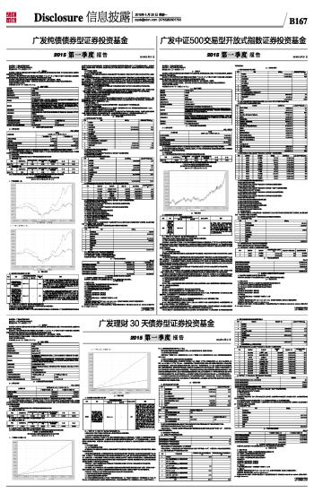 基金管理人:广发基金管理有限公司 基金托管人:中国工商银行股份有限公司 报告送出日期:二〇一五年四月二十日 §1 重要提示 基金管理人的董事会及董事保证本报告所载资料不存在虚假记载、误导性陈述或重大遗漏,并对其内容的真实性、准确性和完整性承担个别及连带责任。 基金托管人中国工商银行股份有限公司根据本基金合同规定,于2015年4月15日复核了本报告中的财务指标、净值表现和投资组合报告等内容,保证复核内容不存在虚假记载、误导性陈述或者重大遗漏。 基金管理人承诺以诚实信用、勤勉尽责的原则管理和运用基金资产,但不保证基金一定盈利。 基金的过往业绩并不代表其未来表现。投资有风险,投资者在作出投资决策前应仔细阅读本基金的招募说明书。 本报告中财务资料未经审计。 本报告期自2015年1月1日起至3月31日止。 §2 基金产品概况 ■ §3 主要财务指标和基金净值表现 3.1 主要财务指标 单位:人民币元 ■ 注:(1)所述基金财务指标不包括持有人认购和交易基金的各项费用,计入费用后实际收益水平要低于所列数字。 (2)本期已实现收益指基金本期利息收入、投资收益、其他收入(不含公允价值变动收益)扣除相关费用后的余额,本期利润为本期已实现收益加上本期公允价值变动收益。 3.2 基金净值表现 3.2.1 本报告期基金份额净值增长率及其与同期业绩比较基准收益率的比较 ■ 3.2.2自基金合同生效以来基金累计净值增长率变动及其与同期业绩比较基准收益率变动的比较 广发中证500交易型开放式指数证券投资基金 累计净值增长率与业绩比较基准收益率历史走势对比图 (2013年4月11日至2015年3月31日) ■ §4 管理人报告 4.1 基金经理(或基金经理小组)简介 ■ 注:1.“任职日期”和“离职日期”指公司公告聘任或解聘日期。 2.证券从业的含义遵从行业协会《证券业从业人员资格管理办法》的相关规定。 4.2 管理人对报告期内本基金运作遵规守信情况的说明 本报告期内,本基金管理人严格遵守《中华人民共和国证券投资基金法》及其配套法规、《广发中证500交易型开放式指数证券投资基金基金合同》和其他有关法律法规的规定,本着诚实信用、勤勉尽责的原则管理和运用基金资产,在严格控制风险的基础上,为基金持有人谋求最大利益。本报告期内,基金运作合法合规,无损害基金持有人利益的行为,基金的投资管理符合有关法规及基金合同的规定。 4.3 公平交易专项说明 4.3.1 公平交易制度的执行情况 公司通过建立科学、制衡的投资决策体系,加强交易分配环节的内部控制,并通过实时的行为监控与及时的分析评估,保证公平交易原则的实现。 在投资决策的内部控制方面,公司制度规定投资组合投资的股票必须来源于备选股票库,重点投资的股票必须来源于核心股票库。公司建立了严格的投资授权制度,投资组合经理在授权范围内可以自主决策,超过投资权限的操作需要经过严格的审批程序。在交易过程中,中央交易部按照“时间优先、价格优先、比例分配、综合平衡”的原则,公平分配投资指令。监察稽核部风险控制岗通过投资交易系统对投资交易过程进行实时监控及预警,实现投资风险的事中风险控制;稽核岗通过对投资、研究及交易等全流程的独立监察稽核,实现投资风险的事后控制。 本报告期内,上述公平交易制度总体执行情况良好,不同的投资组合受到了公平对待,未发生任何不公平的交易事项。 4.3.2 异常交易行为的专项说明 本公司原则上禁止不同投资组合之间(完全按照有关指数的构成比例进行证券投资的投资组合除外)或同一投资组合在同一交易日内进行反向交易。如果因应对大额赎回等特殊情况需要进行反向交易的,则需经公司领导严格审批并留痕备查。 本投资组合为完全按照有关指数的构成比例进行证券投资的投资组合。本报告期内,本投资组合与本公司管理的其他投资组合发生过同日反向交易的情况,但成交较少的单边交易量不超过该证券当日成交量的5%。这些交易不存在任何利益输送的嫌疑。 4.4 报告期内基金的投资策略和业绩表现说明 4.4.1报告期内基金投资策略和运作分析 (1)投资策略 作为ETF基金,本基金将继续秉承指数化被动投资策略,积极应对成份股调整、基金申购赎回等因素对指数跟踪效果带来的冲击,进一步降低基金的跟踪误差。 (2)运作分析 报告期内,本基金交易和申购赎回正常,运作过程中未发生风险事件。 报告期内,本基金日均跟踪误差为0.02%,年化跟踪误差为0.38%,符合要求。 报告期内,本基金跟踪误差来源主要是申购、赎回和成份股调整因素,作为ETF基金,申赎影响相对较小且本基金成立以来规模稳步增长,目前的规模水平下,申购赎回因素对本基金跟踪误差的影响较小。 4.4.2报告期内基金的业绩表现 本报告期内,本基金的净值增长率为36.17%,同期业绩比较基准收益率为36.27%,较好地跟踪了指数。 4.5管理人对宏观经济、证券市场及行业走势的简要展望 2015年1季度,整体市场延续了上涨趋势,中证500上涨36.27%,而同期中小板块、创业板块涨幅靠前,大盘蓝筹涨幅靠后,差异明显,市场存在轮动效应,牛市行情得到市场认可。 展望2季度,在宏观经济继续呈现弱势运行的情况下,政府依旧会推进结构调整,行业改革的宏观政策,为未来经济的健康持续发展做铺垫,同时政府也希望通过股市进行配