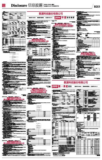 第一节 重要提示 公司董事会、监事会及董事、监事、高级管理人员保证季度报告内容的真实、准确、完整,不存在虚假记载、误导性陈述或者重大遗漏,并承担个别和连带的法律责任。 所有董事均已出席了审议本次季报的董事会会议。 公司负责人章国经、主管会计工作负责人及会计机构负责人(会计主管人员)李兴哲声明:保证季度报告中财务报表的真实、准确、完整。 第二节 主要财务数据及股东变化 一、主要会计数据和财务指标 公司是否因会计政策变更及会计差错更正等追溯调整或重述以前年度会计数据 □ 是 √ 否 ■ 非经常性损益项目和金额 √ 适用 □ 不适用 单位:元 ■ 对公司根据《公开发行证券的公司信息披露解释性公告第1号——非经常性损益》定义界定的非经常性损益项目,以及把《公开发行证券的公司信息披露解释性公告第1号——非经常性损益》中列举的非经常性损益项目界定为经常性损益的项目,应说明原因 √ 适用 □ 不适用 ■ 二、报告期末股东总数及前十名股东持股情况表 1、报告期末普通股股东总数及前十名普通股股东持股情况表 单位:股 ■ 公司前10名普通股股东、前10名无限售条件普通股股东在报告期内是否进行约定购回交易 □ 是 √ 否 公司前10名普通股股东、前10名无限售条件普通股股东在报告期内未进行约定购回交易。 2、报告期末优先股股东总数及前十名优先股股东持股情况表 □ 适用 √ 不适用 第三节 重要事项 一、报告期主要会计报表项目、财务指标发生变动的情况及原因 √ 适用 □ 不适用 ■ 现金流量表说明: 2015年3月31日现金流量表中现金期末数为226,800,385.19元,2015年3月31日资产负债表中货币资金期末数为257,871,782.16元,差额31,071,396.97元,系现金流量表现金期末数扣除了不符合现金及现金等价物标准的银行承兑汇票保证金13,740,990.70元,保函保证金1,583,835.10元,用于质押的定期存款15,746,571.17元。 2014年度现金流量表中现金期末数为112,976,670.57元,2014年12月31日资产负债表中货币资金期末数为305,149,698.03元,差额192,173,027.46元,系现金流量表现金期末数扣除了不符合现金及现金等价物标准的银行承兑汇票保证金1,251,953.46元,信用证保证金2,997,000.00元,保函保证金3,500,000.00元,用于质押的定期存款184,424,074.00元。 二、重要事项进展情况及其影响和解决方案的分析说明 □ 适用 √ 不适用 三、公司或持股5%以上股东在报告期内发生或以前期间发生但持续到报告期内的承诺事项 √ 适用 □ 不适用 ■ 四、对2015年1-6月经营业绩的预计 预测年初至下一报告期期末的累计净利润可能为亏损或者与上年同期相比发生大幅度变动的警示及原因说明 □ 适用 √ 不适用 五、证券投资情况 □ 适用 √ 不适用 公司报告期不存在证券投资。 六、持有其他上市公司股权情况的说明 √ 适用 □ 不适用 ■ 七、衍生品投资情况 □ 适用 √ 不适用 公司报告期不存在衍生品投资。 八、报告期内接待调研、沟通、采访等活动登记表 √ 适用 □ 不适用 ■ 数源科技股份有限公司 董事长:章国经 2015年4月29日 本版导读: